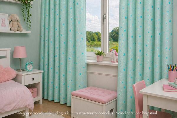 Het Starmint gordijn is een mintgroen meidjesgordijn, boordevol grote en kleine sterretjes in aqua blauw. Laat de sterretjes speciaal voor jou stralen! Een gordijn met sterretjes is uniek en tegelijkertijd tijdloos. Gemakkelijk te combineren met andere patronen in behang of beddengoed. De sterren zijn ±1cm groot en hebben een onderlinge afstand van 4-6 cm. De kleur is aan de voorzijde ge...
