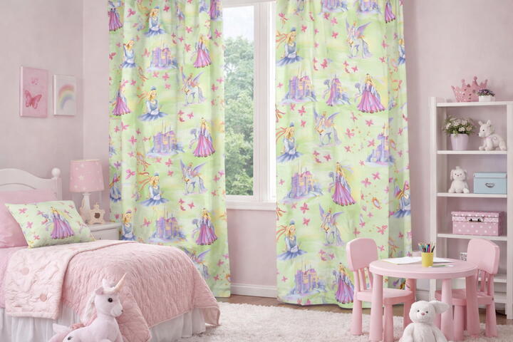 Laat de fantasie van je kleine prinses tot leven komen met ons Unicorn Prinses gordijn. Dit zacht groen-gele gordijn is versierd met prachtige afbeeldingen van prinsessen gehuld in mooie roze en blauwe jurken, een gracieuze eenhoorn en een majestueus paleis omringd door schattige roze vlindertjes.