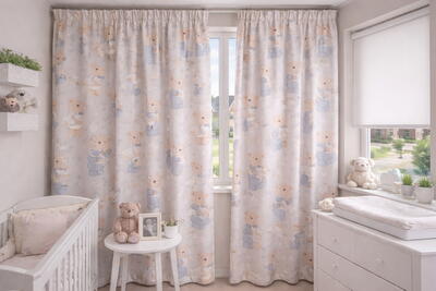 De stof valt soepel, voelt prettig aan en is subtiel geribd geweven. Deze fijne structuur geeft het gordijn net wat extra diepte en karakter, zonder druk te ogen. De teddybeertjes zijn duidelijk zichtbaar, maar zacht van kleur en vriendelijk van uitstraling, waardoor het gordijn perfect past binnen een rustige slaapomgeving.