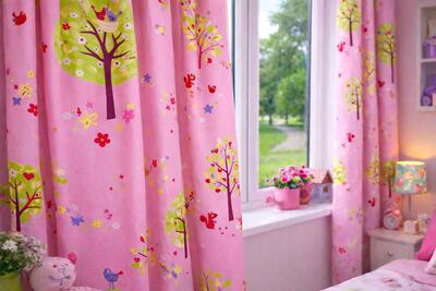 Gordijn Happy Tree is een prachtige keuze voor een kinderkamer waarin kleur, fantasie en een gezellige sfeer samenkomen. Op de afbeelding zie je een speels en vriendelijk dessin dat de ruimte meteen een lieve en opgewekte uitstraling geeft. De stof is uitgevoerd in een zachte roze basiskleur, waarop een herhalend tafereel van bomen, bloemetjes, vogels, eekhoorntjes en vogelhuisjes is afgebeeld. Dat maakt Happy Tree tot een gordijn dat niet alleen functioneel is, maar ook echt iets toevoegt aan de kamer.