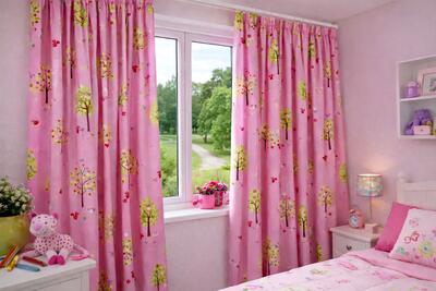De kleurstelling van Happy Tree is zacht en vrolijk tegelijk. De roze basis geeft het gordijn warmte en vriendelijkheid, terwijl de groene boomkruinen voor een fris contrast zorgen. Daarnaast zorgen rode, paarse, gele en witte accenten voor levendigheid in het patroon. Juist deze kleurencombinatie maakt het gordijn heel geschikt voor een kamer met lichte meubels, witte wanden en accessoires in roze of groen. In de afbeelding zie je hoe mooi het dessin samenwerkt met kindermeubels en decoratie, waardoor het geheel een verzorgde en uitnodigende sfeer krijgt.