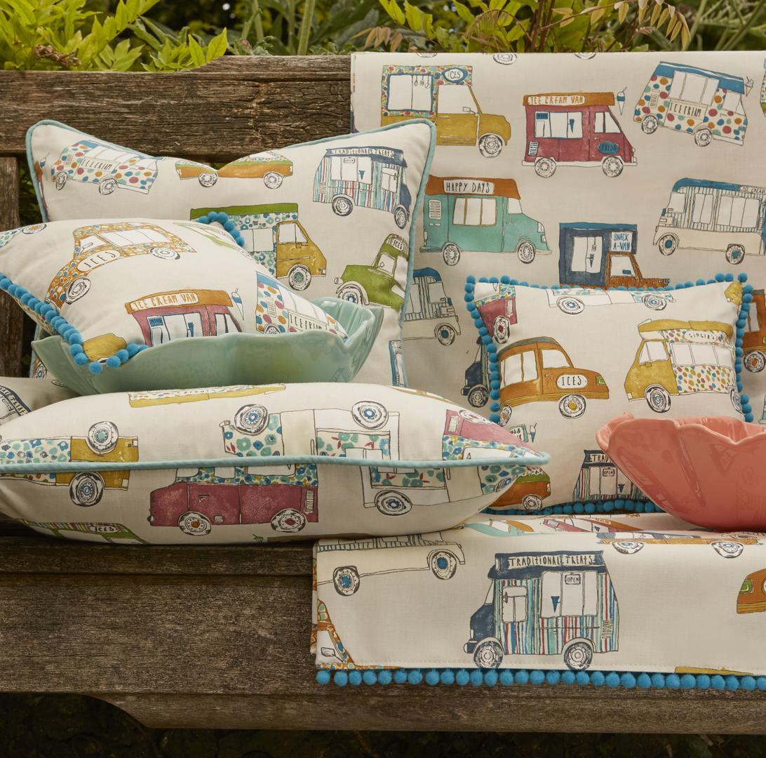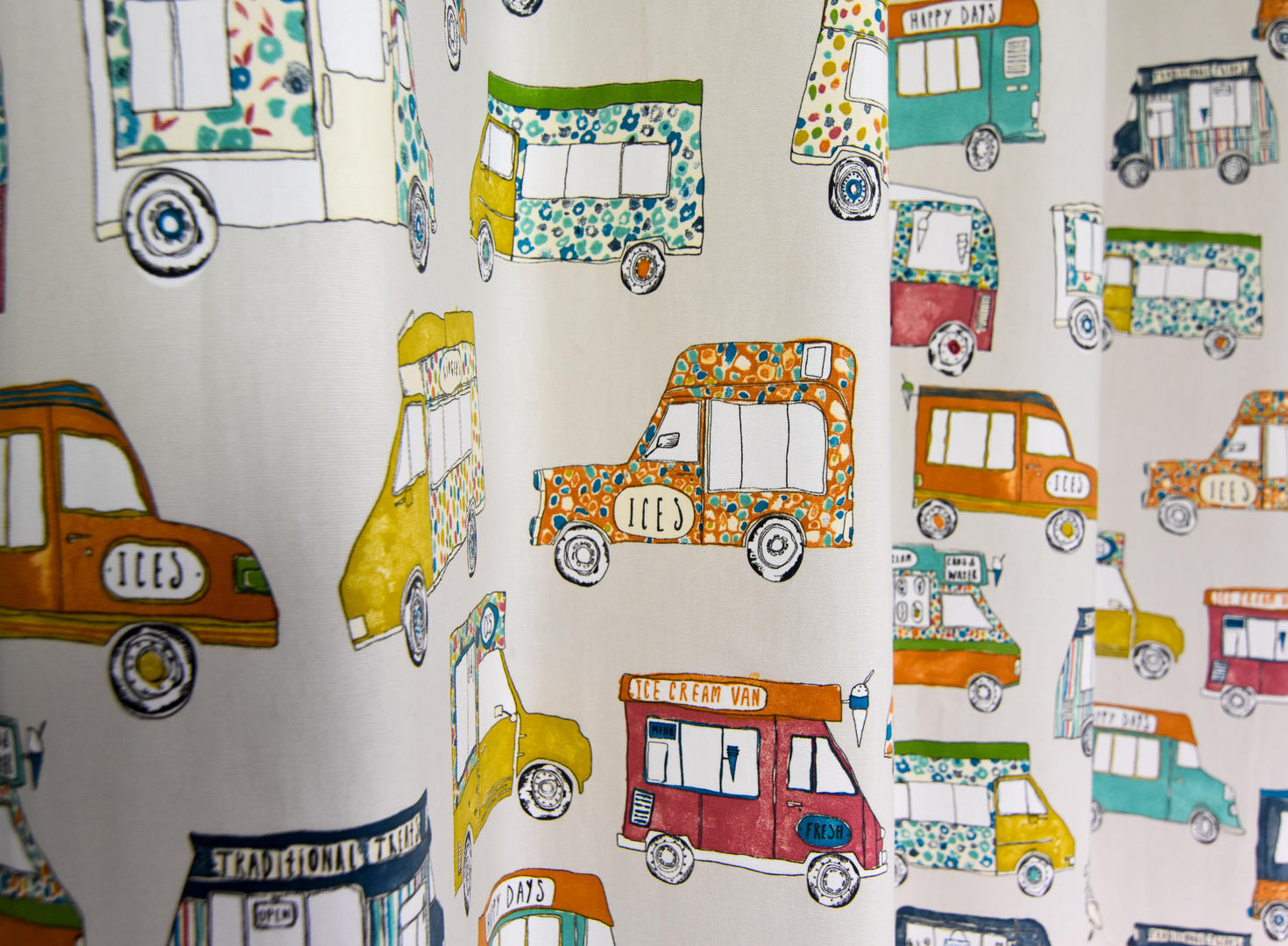 Een autootjes gordijn, maar niet zo maar auto’s: het zijn héérlijke klassieke ijscowagens! De bel klinkt, de ijscoman rijdt door de straat. Daar word je toch vrolijk van? De wagentjes zijn 10 cm groot en gedrukt op stevig geweven, matte katoen. De ondergrondkleur is fraai kiezelgrijs, de gebruikte tinten mooi poederig van kleur. Dat geeft nog even extra dat nostalgische effect. De wafelijsjes en hoorntjes zijn op jouw slaapkamer natuurlijk ‘ijskoude dé beste!’