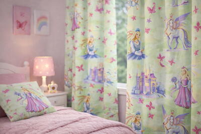 Dit gordijn is niet alleen een decoratieve toevoeging aan de kinderkamer, maar ook een bron van magie en inspiratie. Het brengt een sprookjesachtige sfeer in de ruimte en nodigt uit tot urenlang fantasierijk spel. Je prinsesje kan zich voorstellen dat ze samen met de prinsessen door het paleis danst, op de rug van de eenhoorn rijdt en vlindertjes achtervolgt in een betoverend avontuur.