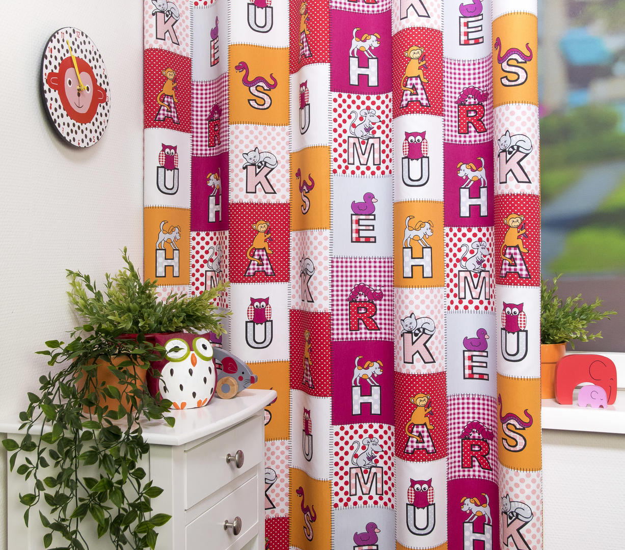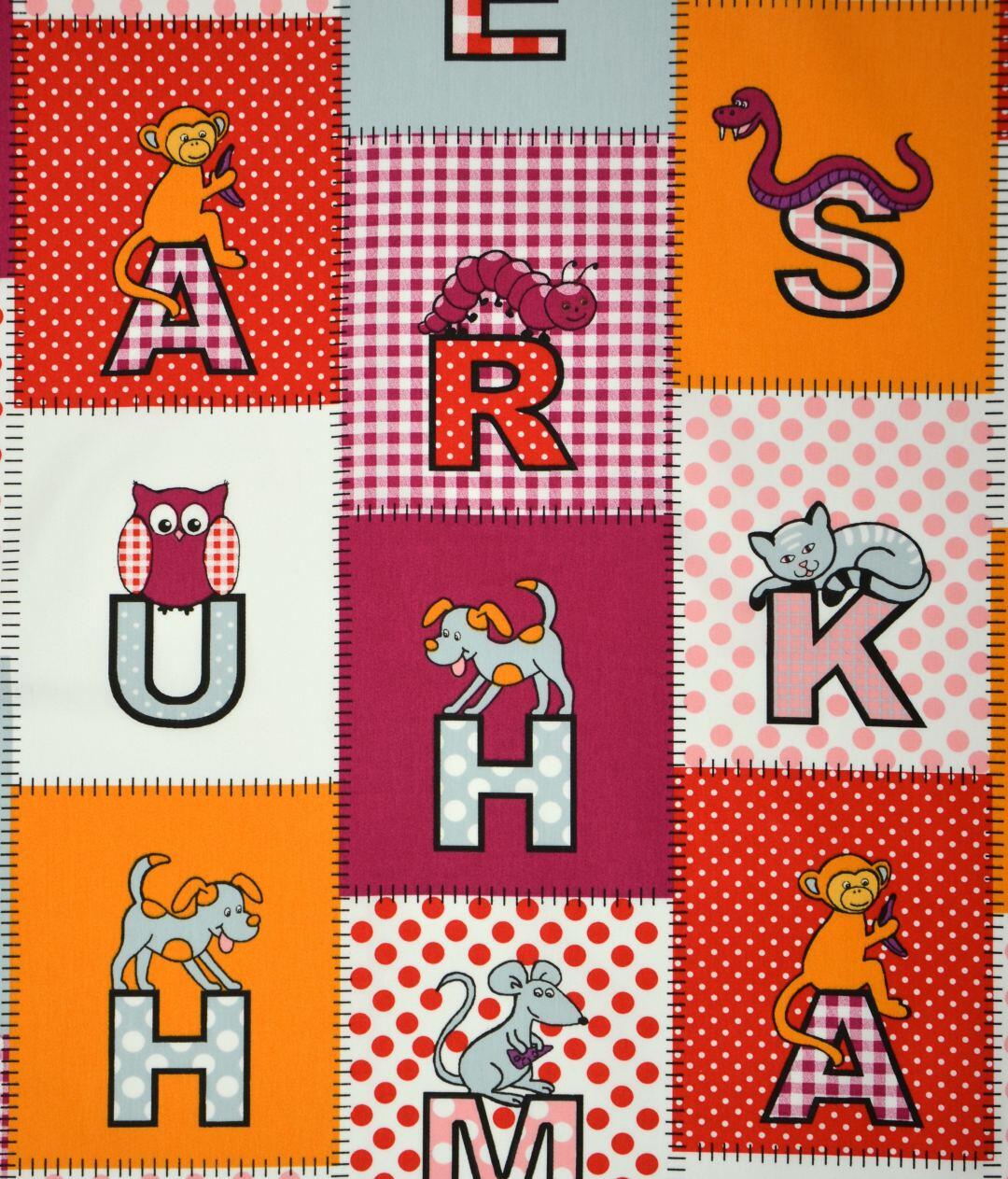 Het Letterblocks gordijn is een vrolijke blikvanger voor iedere baby- en kinderkamer. De stof is opgebouwd uit een mozaïek van vierkante blokken, elk met een eigen achtergrondkleur en dessin. In elk blok staat een letter, gecombineerd met een lief dier of figuurtje, zoals een aapje, uil, muis, hondje, eendje of slang. Zo ontstaat een levendig en speels geheel dat uitnodigt om steeds opnieuw te kijken.