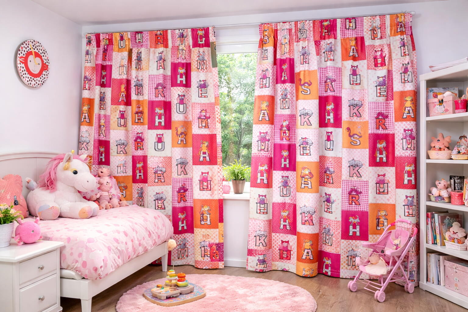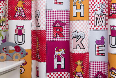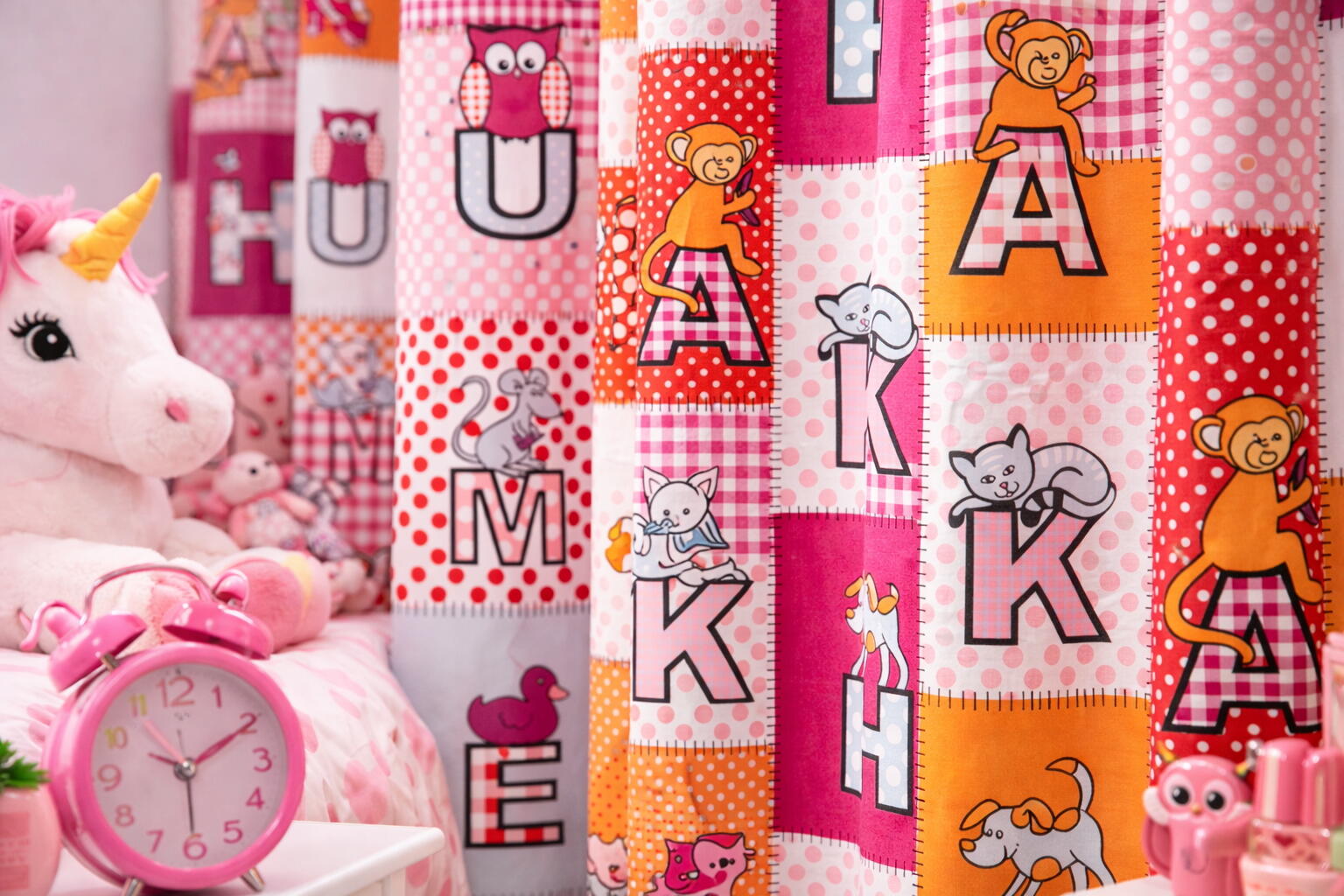 De stof heeft een gladde, fijne weving met een matte uitstraling. Hierdoor komen de kleuren helder naar voren zonder te glanzen. De stof voelt stevig aan en valt mooi in plooien, waardoor het patroon goed zichtbaar blijft wanneer het gordijn hangt. De print is scherp en gelijkmatig aangebracht, zodat elk detail van de figuurtjes en letters duidelijk zichtbaar is.