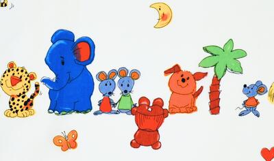 De achtergrond van de stof is gebroken wit tot zacht crème, wat het patroon rustig en licht houdt. Hierop komen de dieren extra mooi naar voren. De kleuren zijn helder maar niet schreeuwerig.