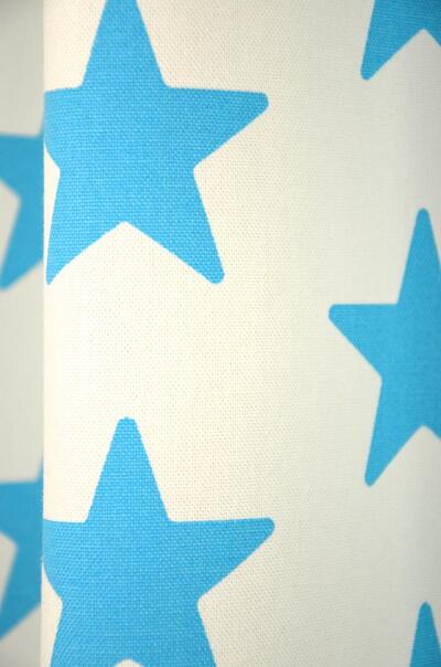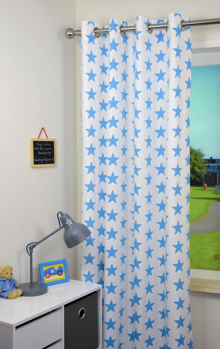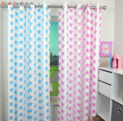Ga je voor roze of ga je voor blauw? Dit leuke én kwalitatief hoogwaardige sterrengordijn kan je perfect afstemmen op jouw kindje. Sterren zijn sprankelend en sterren zijn tijdloos. Deze zijn 8 cm in doorsnede en aan de voorzijde gedrukt op de fraaie, robuust geweven katoen. Dat geeft een zgn. sportieve uitstraling. De ondergrondkleur is warmwit; dim-out voering geeft eventueel extra verduistering. Het thema kan je aanvullen met gestreept behang of een pasteltoon als muurverf. (zachtroze of zachtblauw) Zie jij het plaatje al voor je?