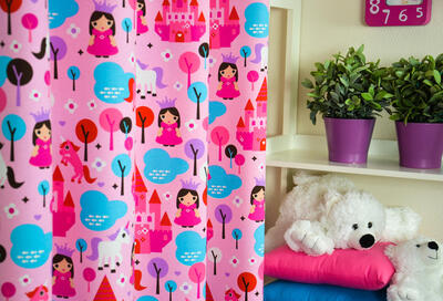 Kastelen, prinsessen en een eenhoorn, een gordijn uit een SPROOKJE! Een sprookje vol magie voor de meisjesslaapkamer. De eenhoorn is een mythisch dier en staat symbool voor zuiverheid. Hier is zij 7 cm groot en het kasteel 18 cm. Gedrukt op matte, ietwat geruwde stof. Het ‘prinsessen thema’ kan je natuurlijk leuk uitbouwen met accessoires; spiegeltjes, juwelenkistje, fluweel & linten. Voor jou als prinsesje in je DROOMkamer! Voor verduistering even voeren.
