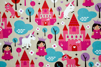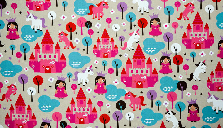 Kastelen, prinsessen en een eenhoorn, een gordijn uit een SPROOKJE! Een sprookje vol magie voor de meisjesslaapkamer. De eenhoorn is een mythisch dier en staat symbool voor zuiverheid. Hier is zij 7 cm groot en het kasteel 18 cm. Gedrukt op matte, ietwat geruwde stof. Het ‘prinsessen thema’ kan je natuurlijk leuk uitbouwen met accessoires; spiegeltjes, juwelenkistje, fluweel & linten. Voor jou als prinsesje in je DROOMkamer! Voor verduistering even voeren.