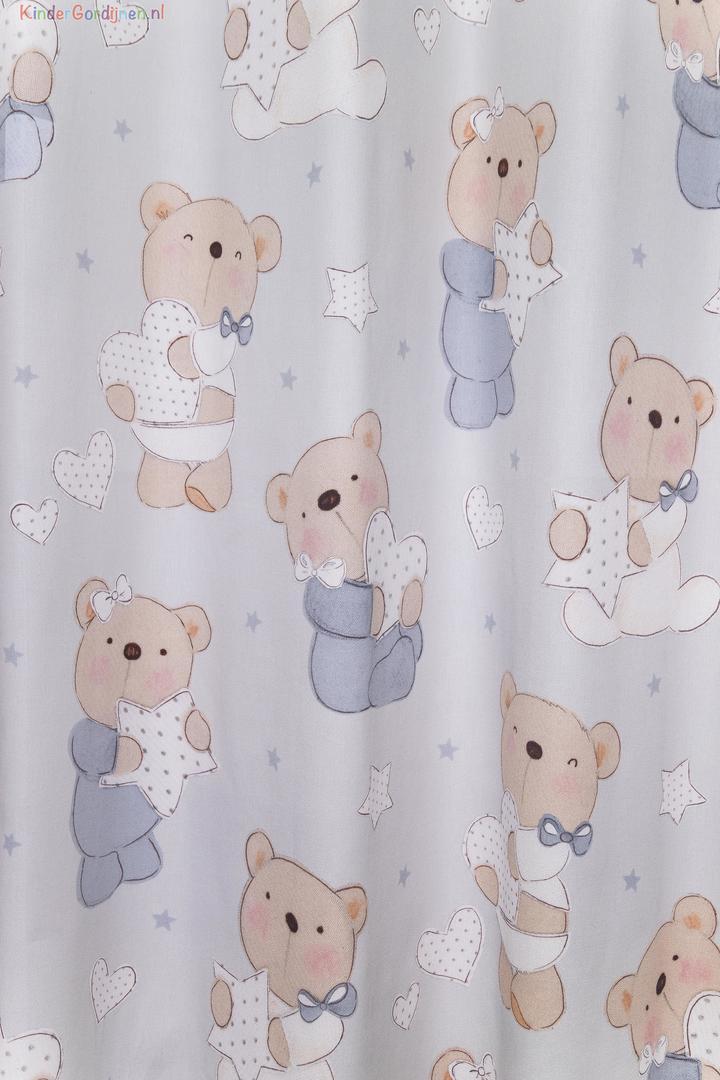 Babybear Blauw De vergrijsd blauwe uitvoering heeft een rustige, eigentijdse uitstraling. De lichtblauwe ondergrond is zacht en niet fel, waardoor het gordijn goed combineert met zowel witte als houten meubels. De teddybeertjes zijn uitgevoerd in warme zand- en crème tinten, wat zorgt voor een mooi contrast. Deze kleur is zeer geschikt voor een jongenskamer of een neutrale babykamer.