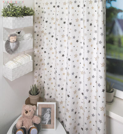 Wat een schitterende kwaliteit gordijnstof! Zien is geloven, zo mooi soepel geweven én maar liefst 280 cm breed! Dat betekent dat het babykamer gordijn meestal naadloos kan worden gemaakt. De is print is gedrukt op een heel fijn geribde stof, wat een vlotte & sportieve uitstraling geeft. Het sterretjes patroon is op de voorzijde gedrukt op de warm witte ondergrond en leverbaar in 3 verschillende kleuren. Blauw- grijs voor de jongenskamer, pastel roze - grijs voor meisjes slaapkamer en camel - gijs voor als je liever geheim wilt houden welk lief kleintje er komt slapen. Combineren kan met een verduisterend rolgordijn uit onze collectie. Of optie voeren aanvinken in het bestelproces wanneer je extra verduistering wenst. Kortom, deze fraaie stofserie is een aanwinst binnen onze enorme collectie!