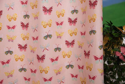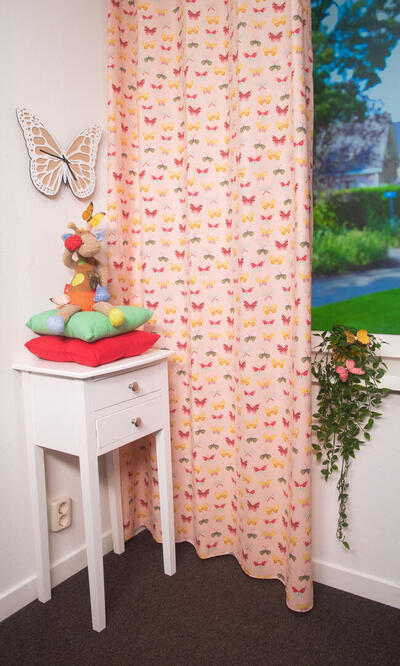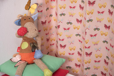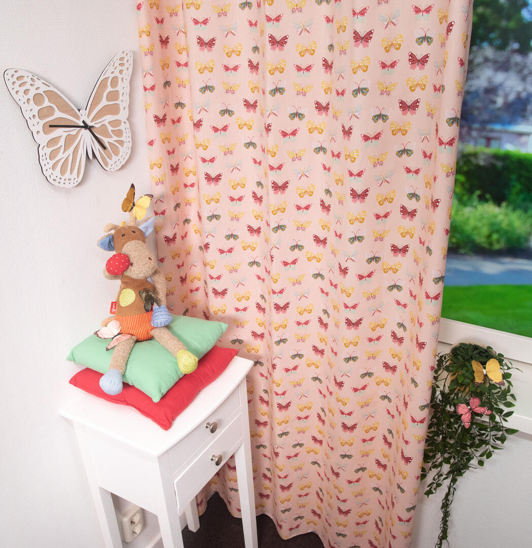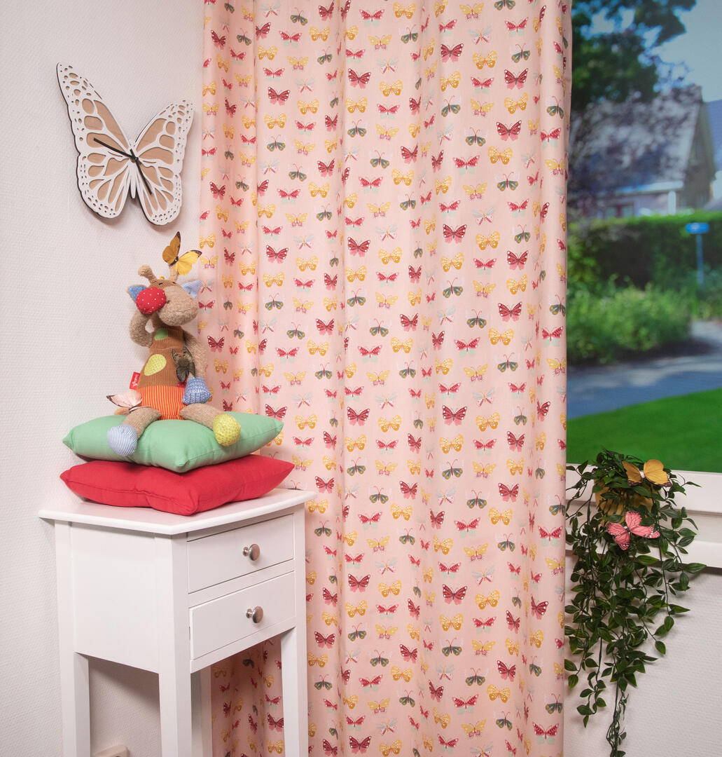 Vlinder, vlinder zoek me dan. Vliegen zó luchtig en sierlijk, ik kan daar wat van. Een vlinder verrast en streelt het oog, wat bijzonder om dat op een gordijn te ‘vangen’. Kunstzinnig en een ideale inspiratiebron voor een prachtig kindergordijn. De stof is leverbaar in 2 verschillende basiskleuren, een fris witte ondergrond of een roze ondergrond beide met met roze, gele en mintkleurige vlinders De stof is heel mooi glad geweven en heeft haast een luchtige satijn uitstraling. Het gordijn komt daardoor prettig fris en tijdloos over.