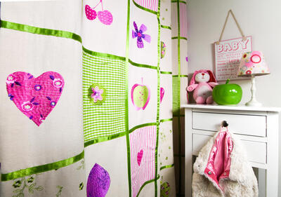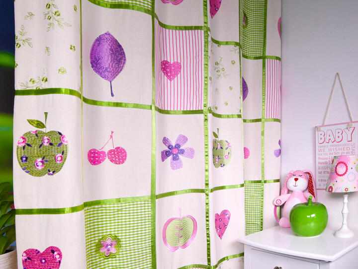 Over deze ondergrond zijn de motieven met borduurgaren aangebracht. Je ziet speelse vormen zoals hartjes, bloemetjes en fruit, die door hun stikwerk subtiel boven de stof liggen. Dat geeft het gordijn een duidelijke textiele beleving die je niet krijgt bij een gewone print. Tussen de geborduurde vlakken lopen glanzende satijnen biezen, die de stof in strakke vierkanten van ongeveer 20 bij 20 centimeter verdelen. Dat contrast tussen de matte katoenstructuur en de licht glimmende bies zorgt voor een levendig geheel dat in een meisjeskamer meteen in het oog springt.