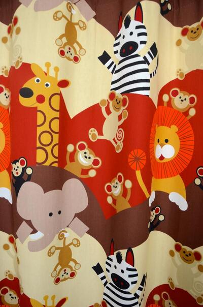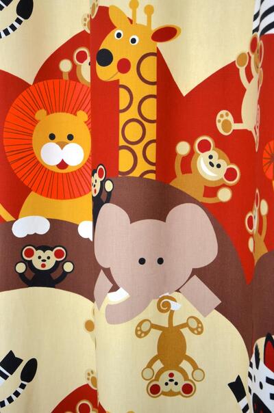 TE GEK, deze nostalgische beestenboel! Héérlijk wegdromen bij deze Afrikaanse dieren. Het patroon is royaal, waardoor het gordijn uitstekend voor grotere raam oppervlaktes geschikt is. De olifant is zo’n 20 cm groot, de giraffe met haar ranke hals natuurlijk wat langer. De dieren zijn gedrukt op matte katoen en desgewenst even verduisterend voeren.