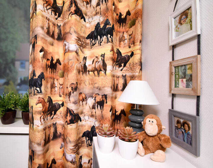 Een super gaaf paardengordijn voor de paardenliefhebber! De afbeeldingen lijken fotografisch echt op stof te zijn gedrukt. De glanzende vacht, wapperende manen en attente oortjes van deze edele dieren, komen allemaal haarscherp over. Daarom is dit gordijn best indrukwekkend en geschikt voor eenieder die de ruitersport een warm hart toedraagt. De krachtige energie spat er vanaf! De paarden zijn +/- 16 cm groot en afgebeeld op matte stof. Deze is aan de achterzijde wit, voor extra kleurbehoud van deze temperamentvolle dieren en verduistering, is voeren aan te bevelen.