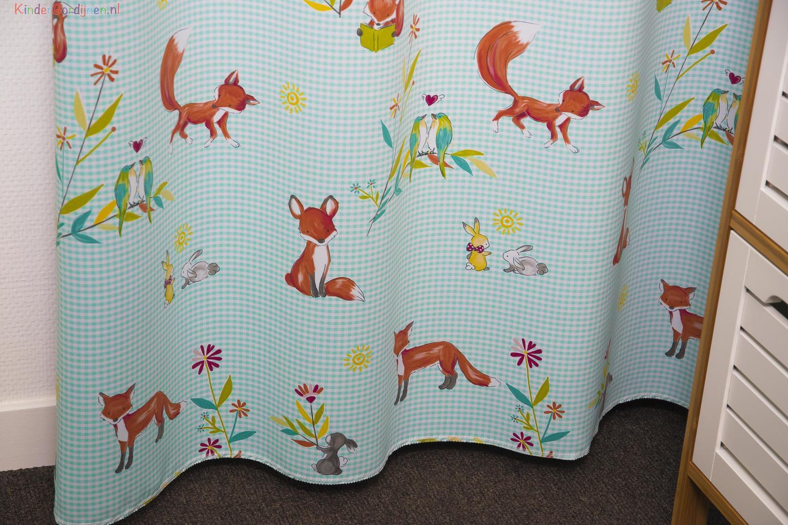 Dat is handig, een decoratief kindergordijn wat direct de slaapkamer behoorlijk donker maakt! Door de dim out laag die de stof al heeft, hoef je eigenlijk niet meer extra te voeren. Het voordeel is dat het gordijn nu heel soepel valt. De stof is leverbaar in 2 kleuren : met een fris geel achtergrond ruitje en een licht turquoise ruitje. Het vrolijke vosje is met de hoge staart 11 cm groot, de verliefde vogeltjes 5 x 8 cm. De achterzijde van de stof is neutraal gebroken wit. Passend in een jongens- en meisjesslaapkamer, dus met dit gordijn zit je altijd goed! Mogen de bosdieren bij jou komen wonen?