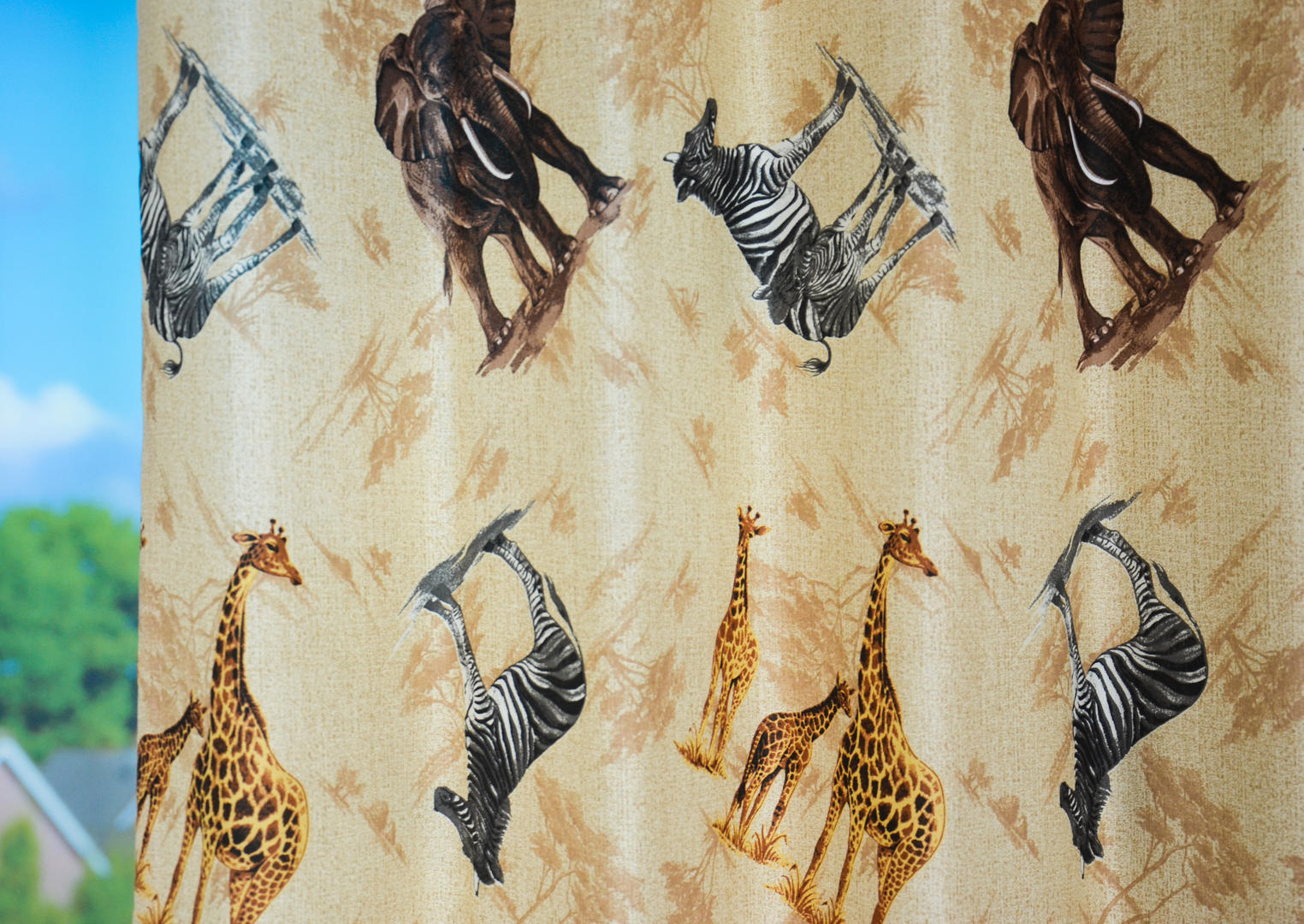 Een gordijn zó vanuit de Savanne! Rond de evenaar is het lekker warm en die gezellige warmte straalt dit gordijn ook uit. De camel kleurige ondergrond, is bedrukt met subtiele bomen en grassen op de achtergrond. Het patroon is royaal en stoer getekend, de olifant is wel 30 cm groot! Doordat de stof niet al te zwaar geweven is, kun je het patroon aan de achterzijde ook aardig zien. Wil je aangenaam donker slapen, dan kun je natuurlijk het Daktari gordijn laten voeren. Dan wordt de achtergrond egaal wit van kleur. Ga je mee op Safari?