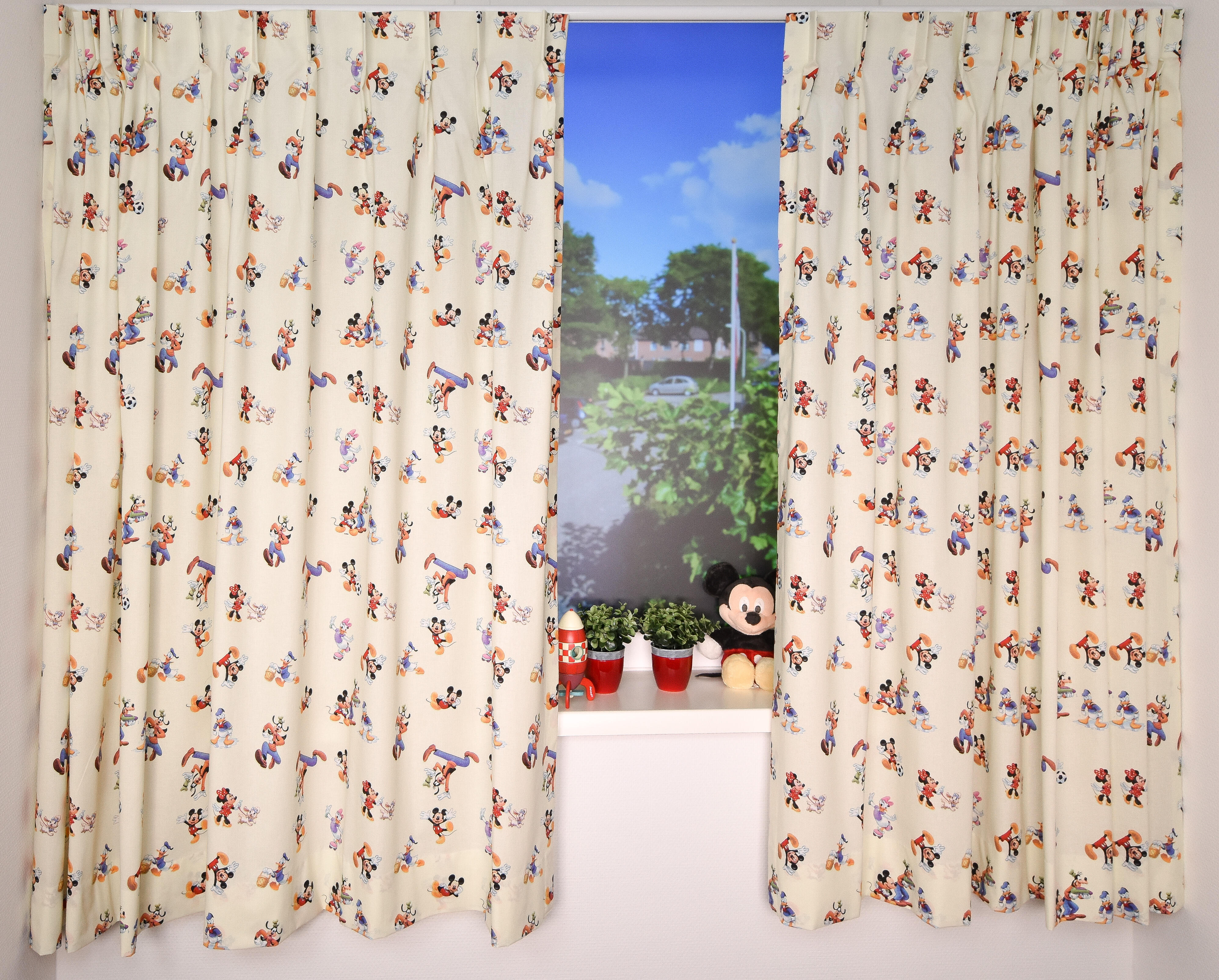 Echte Disney gordijnen, met Mickey en Minnie Mouse en natuurlijk vriend Goofy. Die stuitert hier vrolijk ondersteboven over het gordijn, “Gompy”. Donald en Katrien Duck dansen vrolijk mee. Katrien even charmant als altijd. De stof is mat en heel fijn geweven. De ondergrondkleur is heel zacht vanillegeel, wat voor een extra zonnig effect zorgt. Deze Disney figuren ken je vast van het weekblad Donald Duck of Mickey Mouse clubhuis op TV. Sinds 1934 is Donald de lieveling van jong & oud. Met dit gordijn heb je al die Duckstad vriendjes op je kamer!