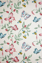 De vlinders en bijen fladderen en zoemen over de mooie iets wat matte katoenen gordijnstof.