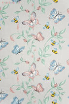 De vlinders en bijen fladderen en zoemen over de mooie iets wat matte katoenen gordijnstof.