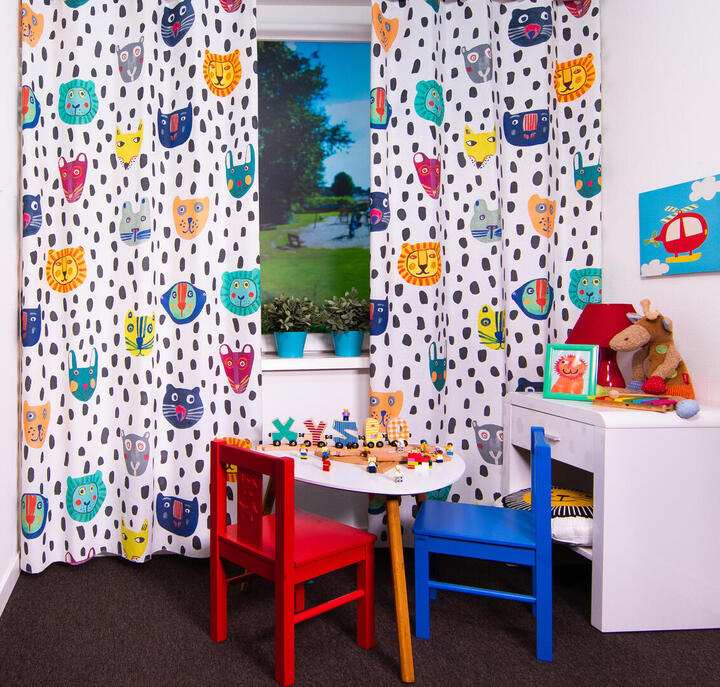 Ontdek het schattige kindergordijn Face Drops, het kindergordijn dat de slaapkamer omtovert tot een speels paradijs! Op een zachte, witte achtergrond prijken schattige dierenhoofden tussen grote, onregelmatige zwarte stippen. Voor een goede nachtrust kan het gordijn worden gevoerd tot een verduisterend en isolerend exemplaar. Wil je de stof eerst ervaren? Bestel een knipstaal voor slechts €2,95, dat bij gordijnbestellingen in mindering kan worden gebracht. Voor vragen sta ik tot je beschikking! Team KinderGordijnen.nl