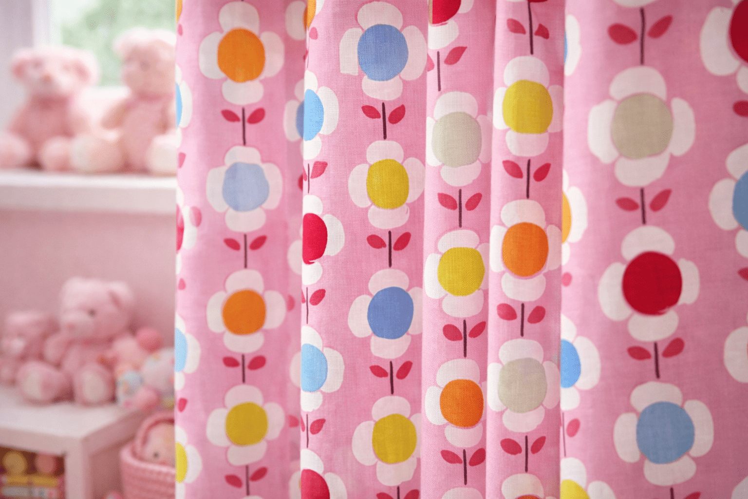 Bloemengordijn voor de baby-meisjeskamer – zacht, vrolijk en tijdloos