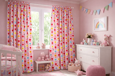 Het patroon is opgebouwd uit gelijkmatige rijen bloemen die mooi over de stof zijn verdeeld. Dit zorgt ervoor dat het gordijn ook wanneer het in plooien hangt zijn ritme behoudt. De bloemen ogen speels, maar door de herhaling blijft het geheel rustig en geschikt voor een slaapkamer waarin ontspanning belangrijk is. Het dessin voelt licht en vrolijk aan en sluit goed aan bij een zachte, gezellige kinderkamer.