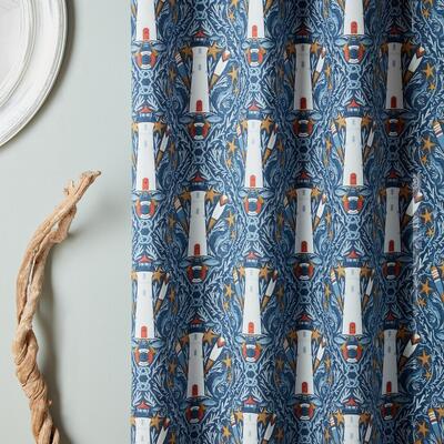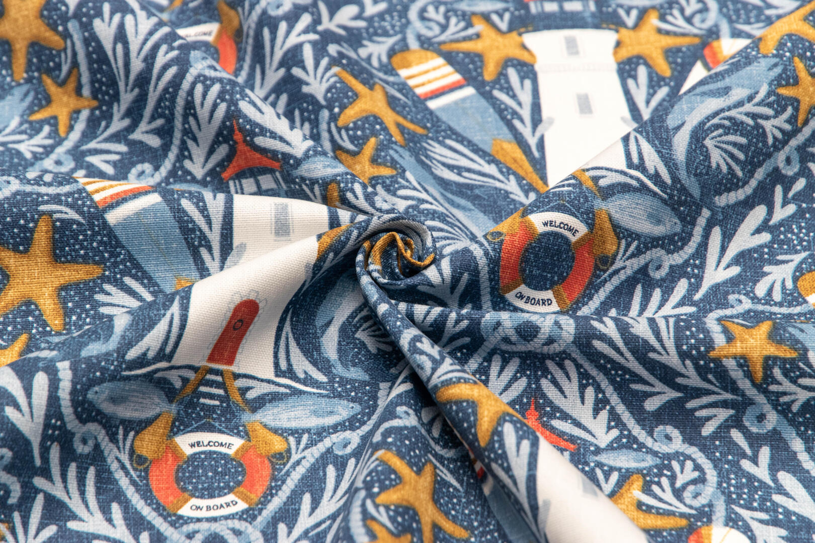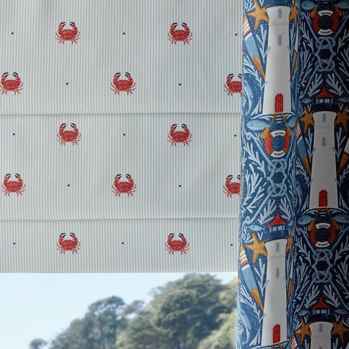 Het maritieme kindergordijn Skippers is een prachtig maritiem kindergordijn. Met zijn rode vuurtorens, scheepstouwmotieven, zeesterretjes, visjes, zeewier en reddingsboeien kan deze stof perfect worden gecombineerd met onze krabbetjes gordijnstof.