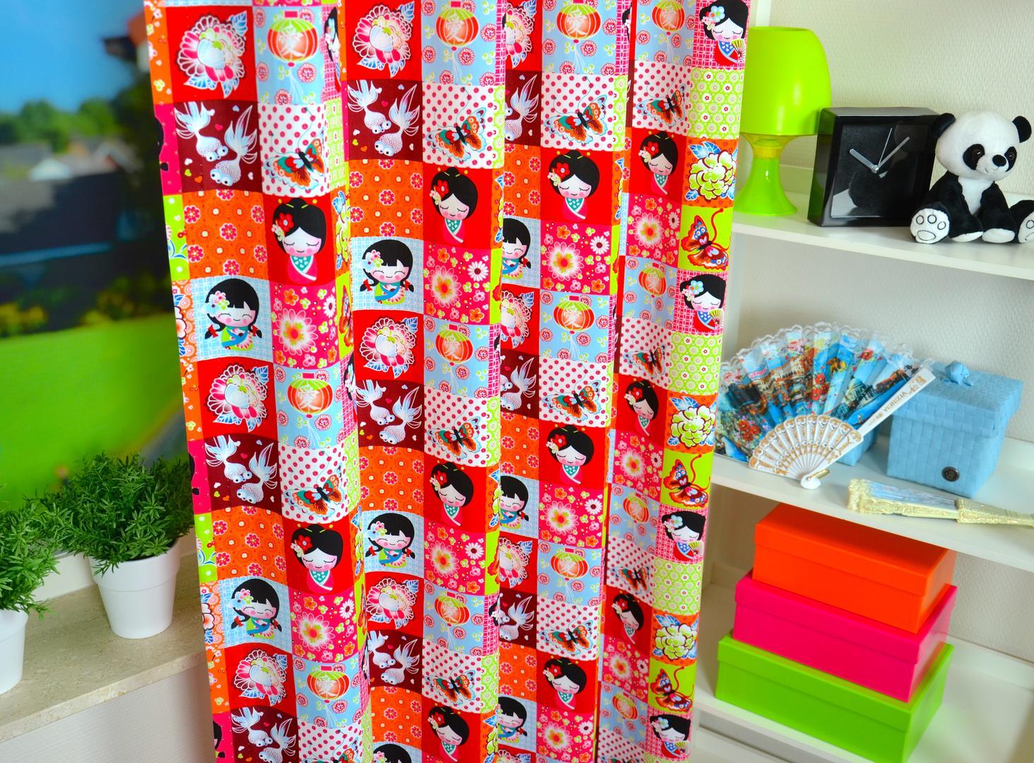 Kleurrijke meisjesgordijnen met een knipoog naar het sprookjesachtige Japan. Het serene meisje met waaier, de goudvisjes met sluierstaart en het klassieke Japanse lampionnetje. De afbeeldingen zijn gedrukt in vierkanten van 8 x 8 cm. Het thema kun je uitbreiden met bijpassende kussentjes of andere Japanse woonaccessoires. Maak van je slaapkamer een sprookje! Wie wil dat nu niet?