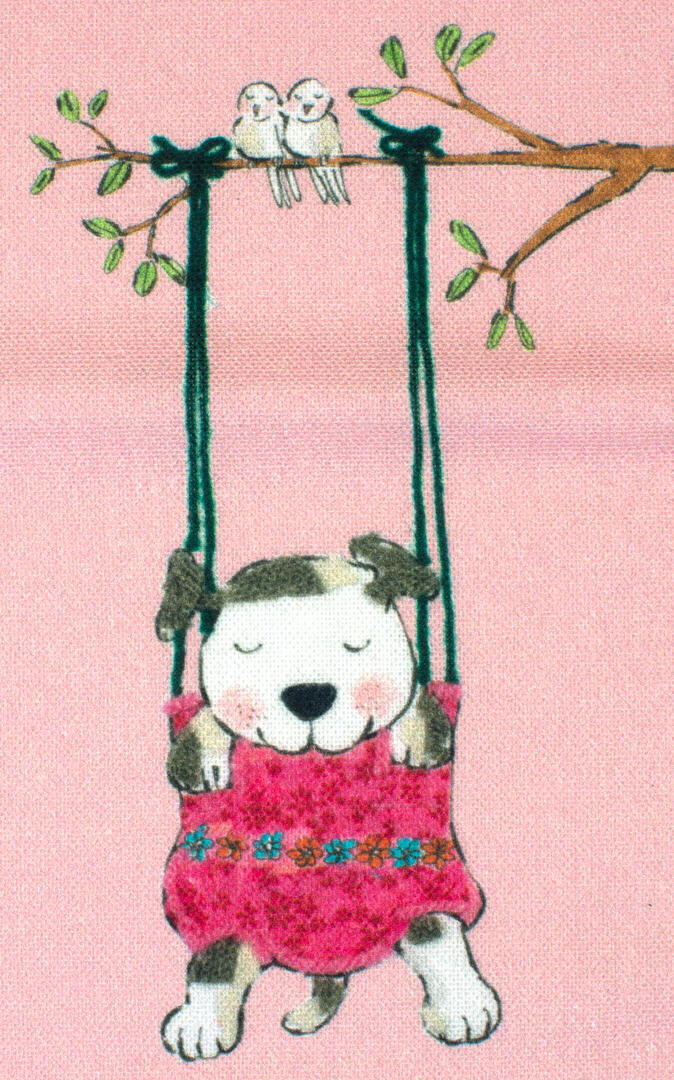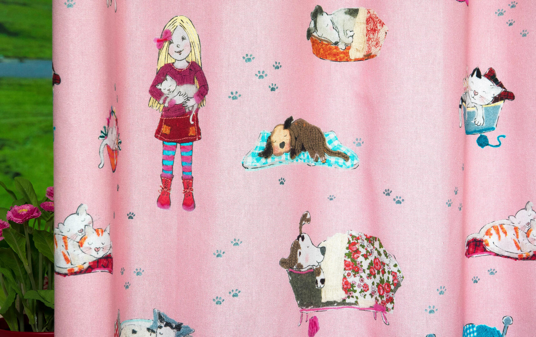 Een súper schattig gordijn voor de kinderkamer, ontworpen door Hanneke de Jager. Deze beeldend kunstenares is schrijver en tevens illustrator van een aantal bijzonder leuke kinderboeken. Zij omschrijft haar stijl als: fris, kleurrijk, levendig, speels en zonnig.Door gebruik van verschillende materialen zoals stofjes van de markt, knopen en gebreide truien, geeft zij haar illustraties iets unieks. In het patroon zie je namelijk de weergave van die leuke details van de verschillende texturen. Zo heeft het slapende hondje een optisch stukje schipperstrui en zijn elegante poezenvriendje een rozenstofje op de sofa.