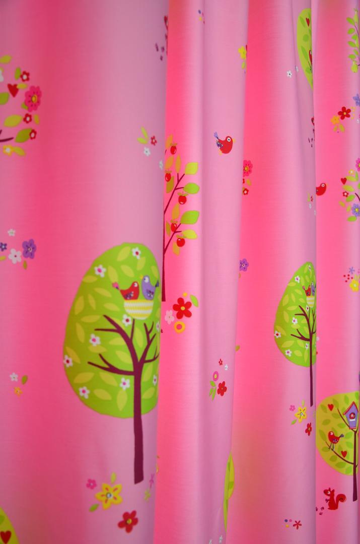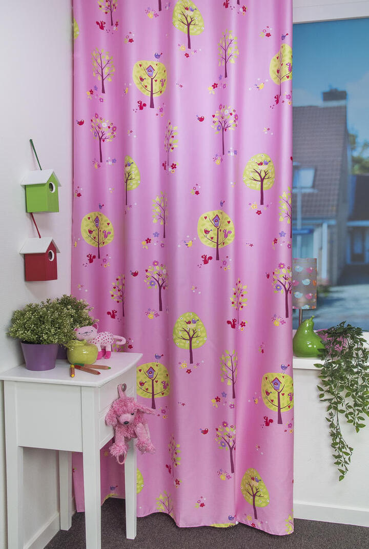 Snoezig meidengordijn vol bomen die omringd worden door schattige eekhoorntjes, vogeltjes en hun huisjes. Dit unieke kindergordijn is uitgevoerd in een lila kleur en past daardoor perfect in een echte meisjeskamer!