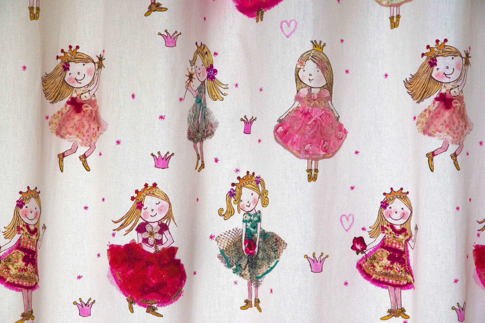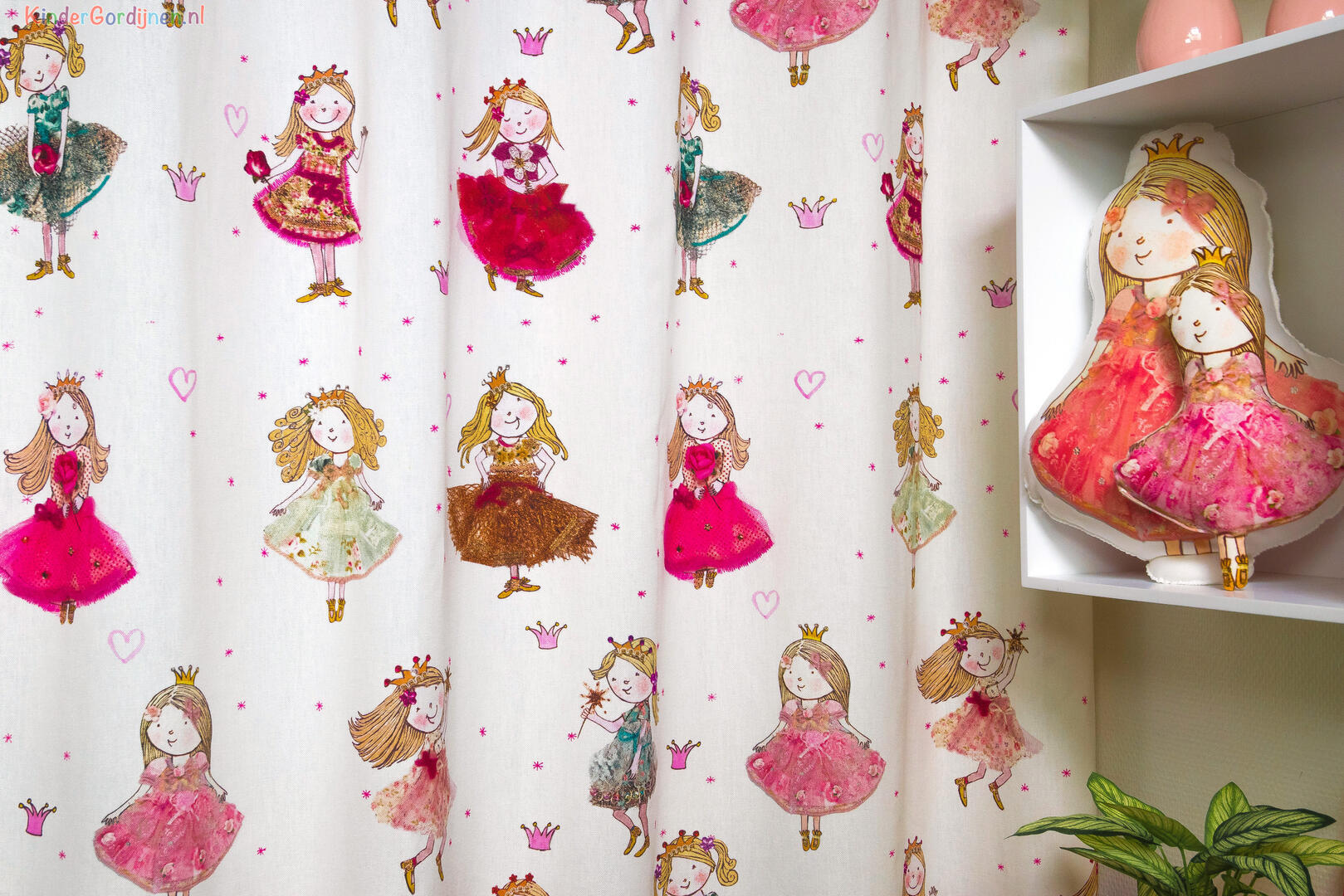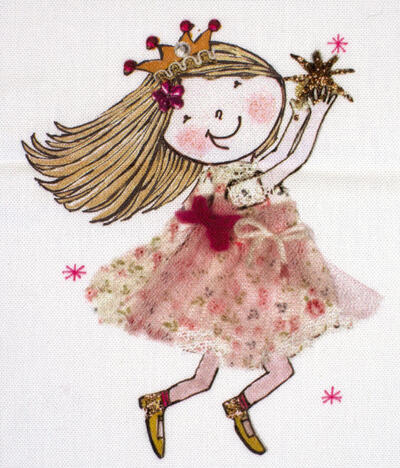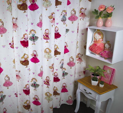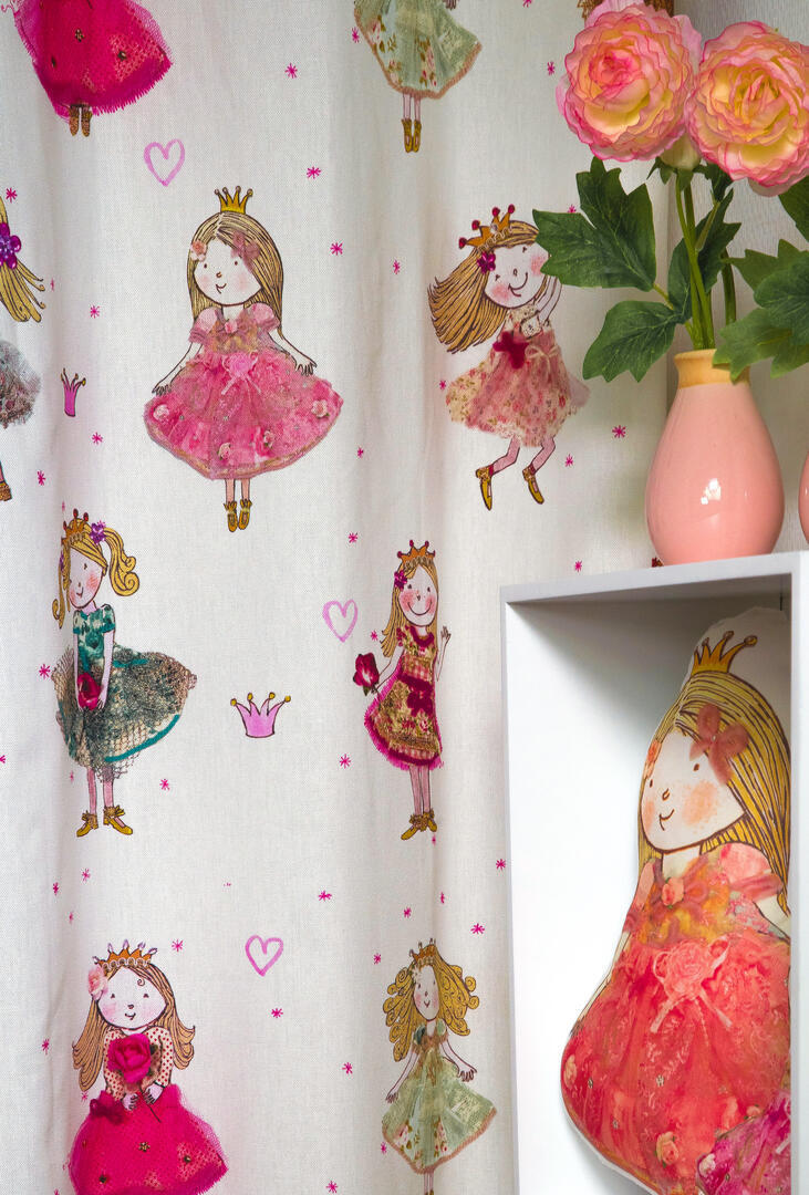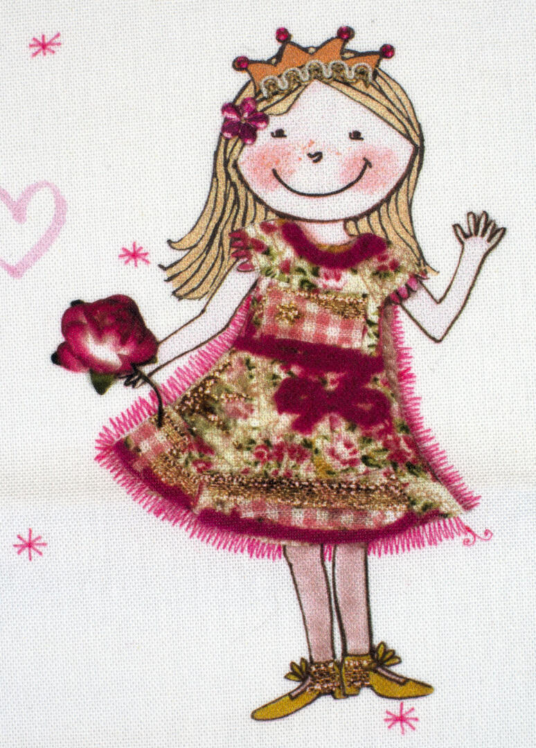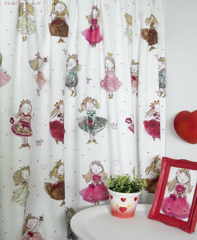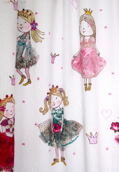 Een súper schattig prinsessengordijn voor de kinderkamer, ontworpen door Hanneke de Jager. Deze beeldend kunstenares is schrijver en tevens illustrator van een aantal bijzonder leuke kinderboeken. Zij omschrijft haar stijl als: fris, kleurrijk, levendig, speels en zonnig. Door gebruik van verschillende materialen zoals stofjes van de markt, knopen en gebreide truien, geeft zij haar illustraties iets unieks. In het patroon zie je namelijk de weergave van die leuke details van de verschillende texturen. Zo heeft het prinsesje een haast levensechte roos vast en haar vriendin en sprankelende toverstaf.