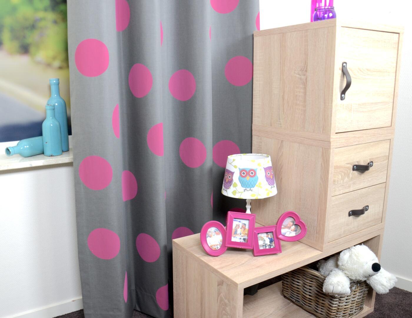 Deze XL stip is een echte eyecatcher in je kamer! Met een diameter van 12 cm zorgt deze royale stip voor een prachtig volume, waardoor de raampartij ruimtelijk oogt zonder te druk te worden. De ondergrondkleur is een warm bruingrijs (taupe), terwijl de stip zelf diep fuchsia is. Daarnaast zijn er ook nog twee andere kleuropties, antraciet en grijs, beschikbaar. Deze combinatie van warme aardekleuren geeft een gezellige en stijlvolle sfeer aan de kamer. De stof van het gordijn is mat en dicht geweven, waardoor het al behoorlijk donker wordt in de slaapkamer. Dit draagt bij aan een goede nachtrust, omdat het helpt om het licht buiten te houden.