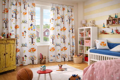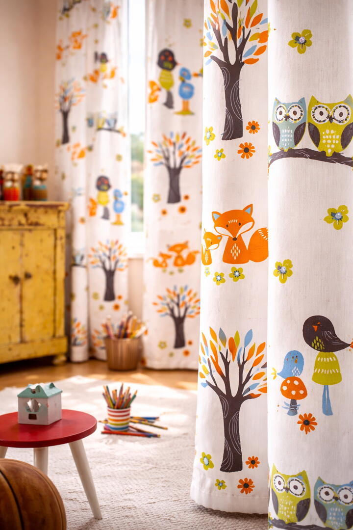 Het gordijn Forest van Esprit is een vrolijk en verhalend dessin dat kinderen elke dag opnieuw meeneemt in een eigen boswereld. In het motief zie je bomen met gekleurde bladeren, nieuwsgierige uiltjes op takken, speelse vosjes, paddenstoelen, bloemen en kleine vogeltjes. Alles is verspreid over een lichte ondergrond met een subtiele verticale structuur in de stof, waardoor het dessin niet druk oogt maar juist rustig en prettig blijft in een kinderkamer.