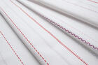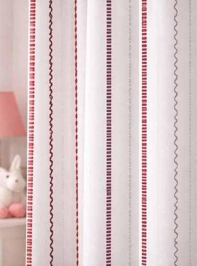 De tweede uitvoering heeft een rustiger en iets krachtiger kleurenpalet van helder rood, diep bordeaux en zacht grijs. De rode en bordeaux strepen geven het gordijn warmte en diepte, terwijl de grijze lijnen voor balans zorgen. Ook hier ligt alles op een lichte ondergrond, waardoor het geheel niet zwaar wordt.