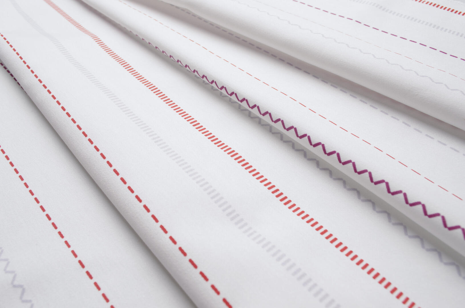 Het gordijn Dotted Line valt op door het ritmische streepmotief dat over de volle hoogte van de stof loopt. Het patroon bestaat uit een afwisseling van fijne stippenlijnen, korte rechthoekige streepjes en smalle zigzagbanen. Deze verschillende lijnsoorten zorgen samen voor een levendig maar overzichtelijk geheel. De verticale richting van het motief laat ramen hoger en slanker ogen, terwijl het zachte lijnenspel het geheel vriendelijk houdt.
