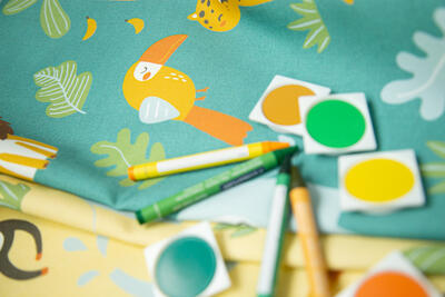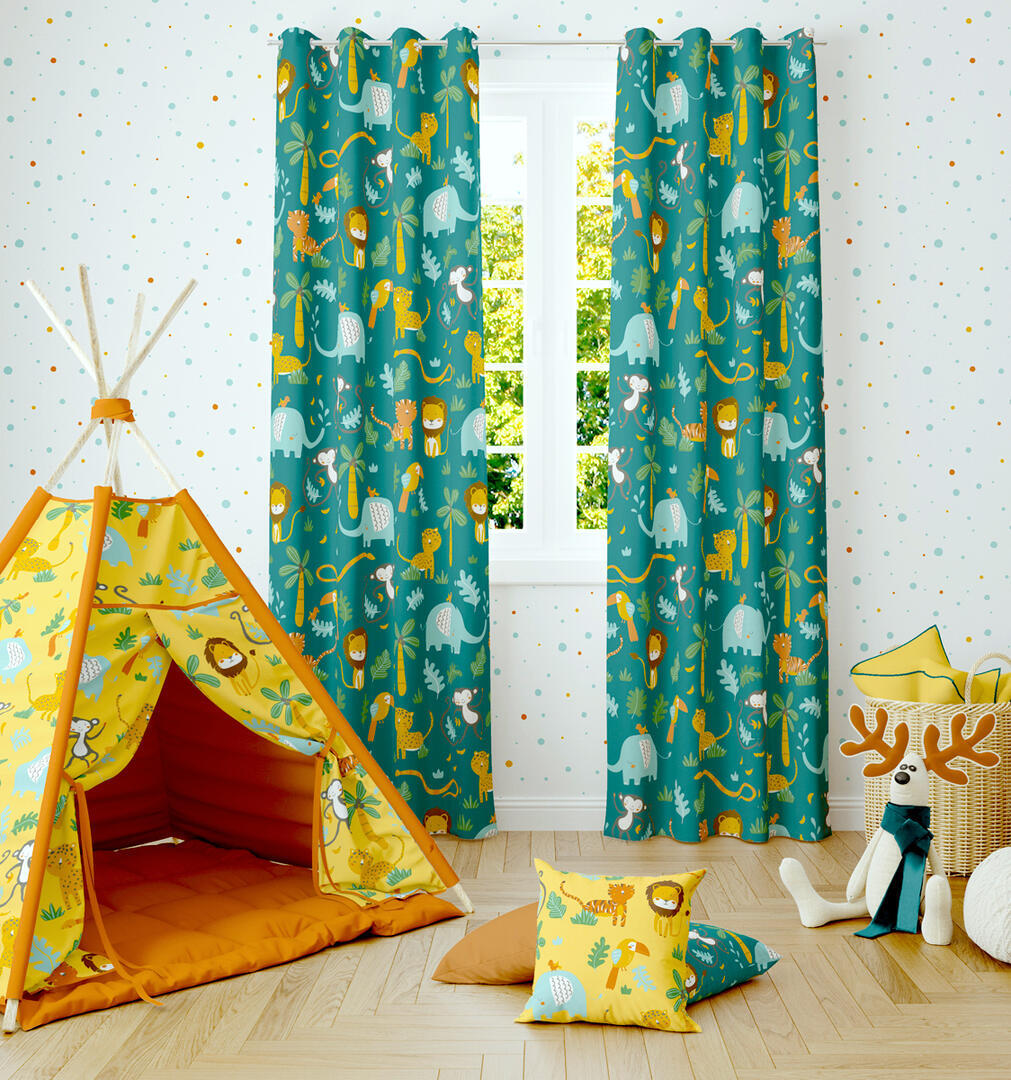 Vrolijk kijken de jungledieren de wereld in!, Is dit babygordijn met z'n vrolijke jungledieren wat voor de kleine van jou? De junglediertjes kijken helder en eigenwijs de slaapkamer in. Door de herhaling van vorm, blijft het gordijn rustig en toch speels. De stof is leverbaar in 2 verschillende kleuren. Voor verduistering desgewenst voeren, een verschil van dag en nacht!💤