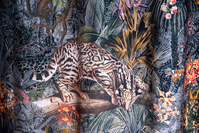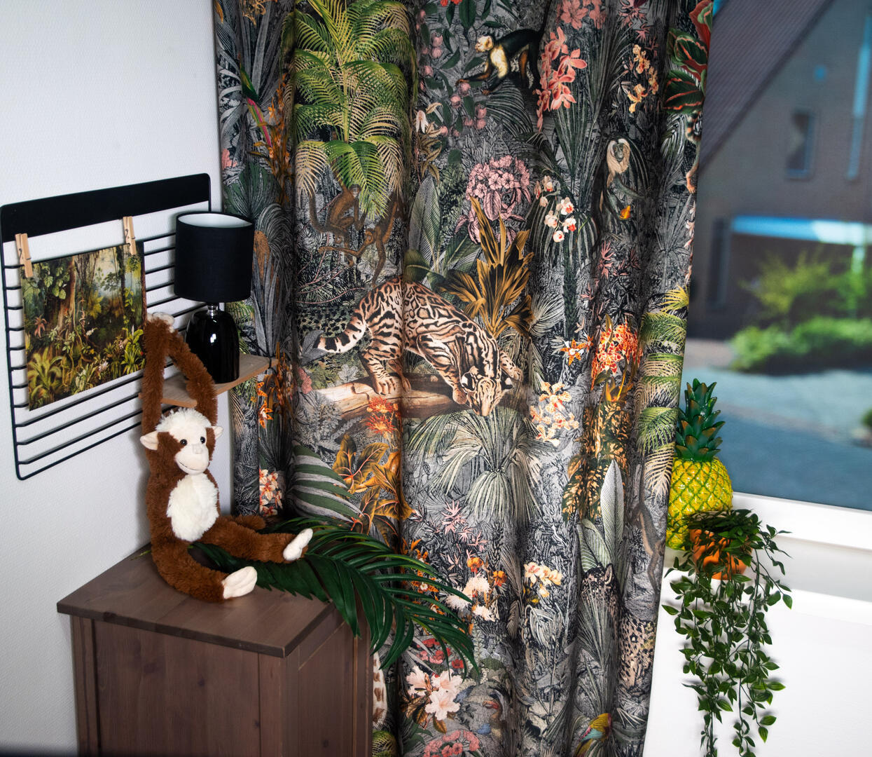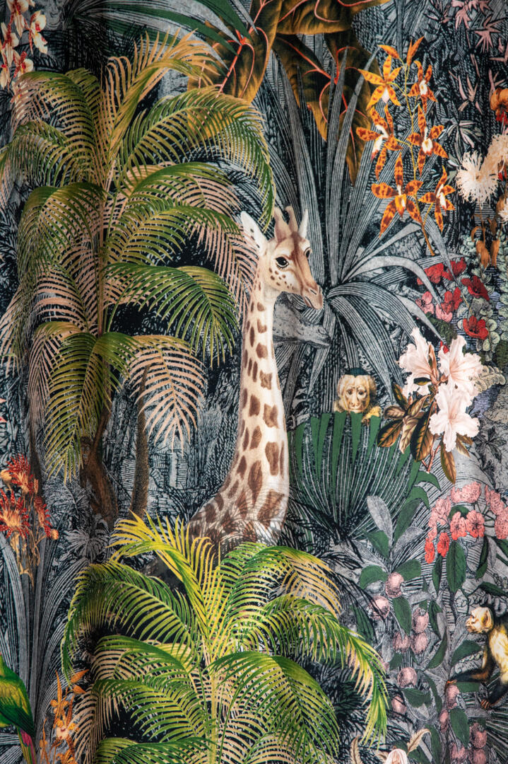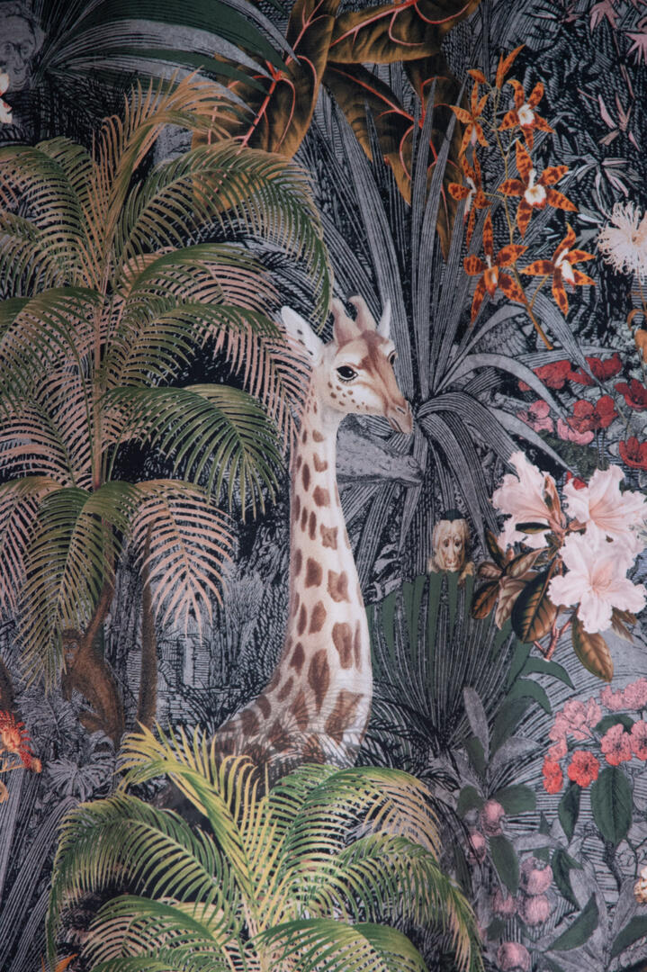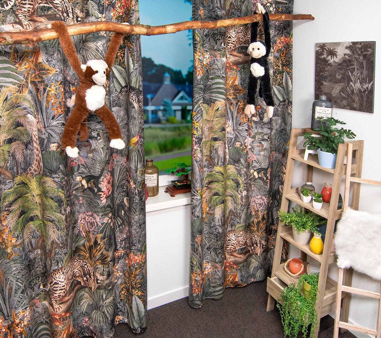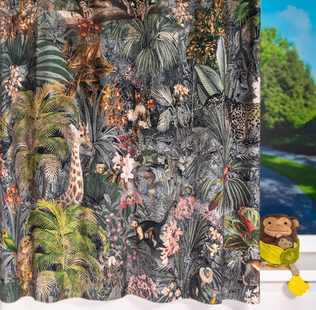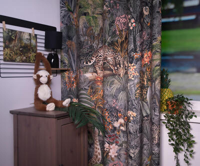 Stap binnen in de betoverende wereld van het kindergordijn Leopards! Op dit zachte velvet gordijn komen giraffes, luipaarden, slingeraapjes, papagaaien en nog veel meer dieren tot leven, verstopt in een weelderige jungle. Kun jij ze allemaal vinden? Dankzij de digitale bedrukking zijn de afbeeldingen haarscherp en levensecht.