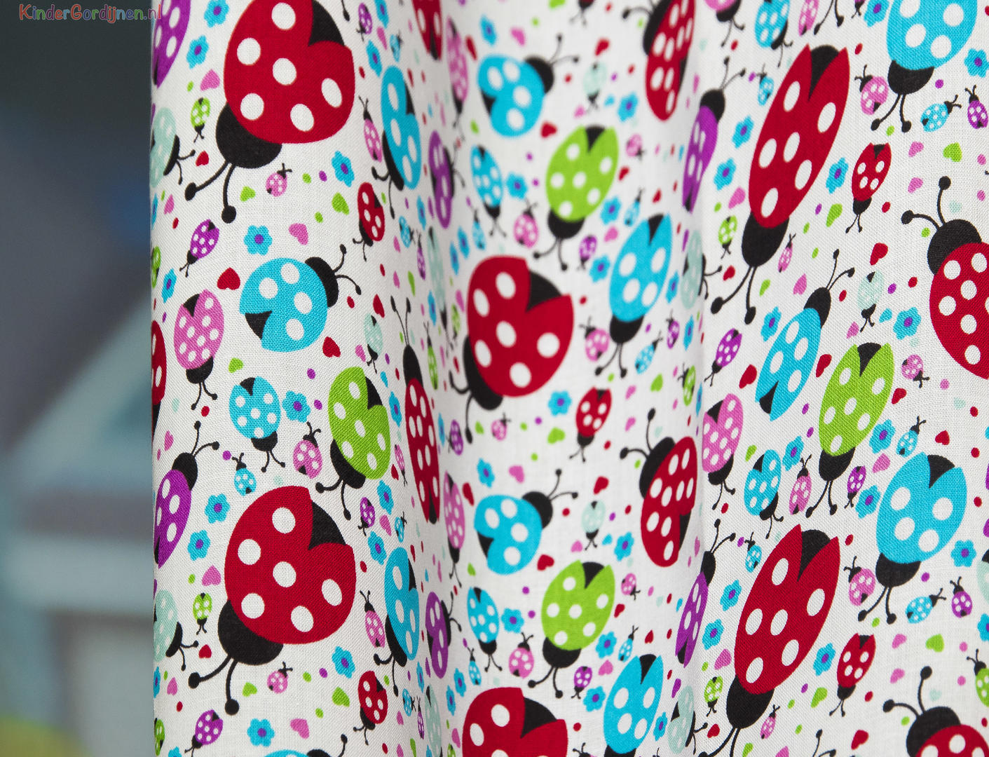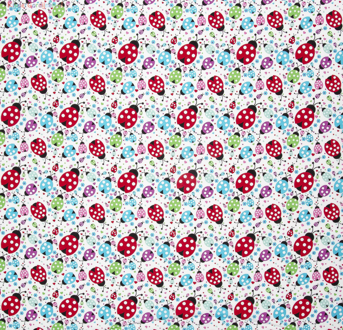 We tonen hier ons kindergordijn "Lief, Lief Beestje." Deze vrolijke stof laat een speels ontwerp zien van lieveheersbeestjes in verschillende levendige kleuren, waaronder opvallend rood, blauw, groen en paars. De lieveheersbeestjes zijn er in alle maten, van groot tot piepklein, en geven een vrolijke uitstraling aan elke kinderkamer. Gemaakt van fijngeweven witte katoen, is dit gordijn zowel zacht als soepel. Dankzij de Oeko-Tex certificering is het perfect veilig voor gebruik in babykamers en geschikt voor zowel jongens als meisjes. Als je een op maat gemaakt gordijn overweegt, kun je een stofstaal bestellen om de textuur en kleuren zelf te beoordelen. Staaltjes worden meestal dezelfde dag nog verzonden. Voor extra isolatie en verduistering kun je tijdens de bestelling kiezen voor een voering.