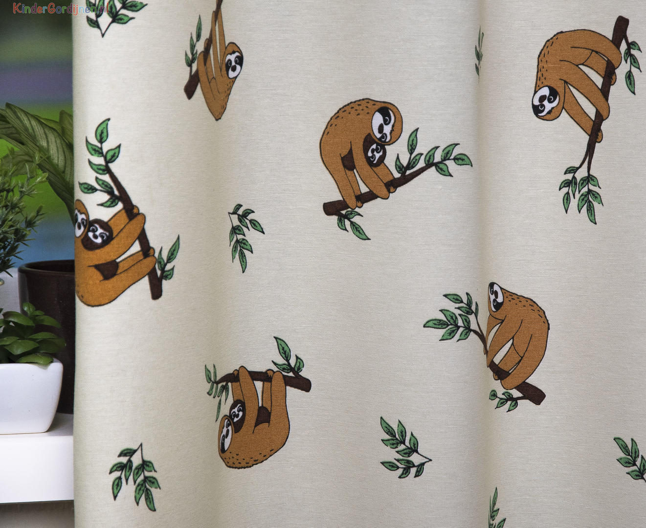Oh kijk nou wat lief! Deze lieve luiaard zijn zo moe dat je automatisch wil slapen. Maar ze zijn ook heel erg lief en schattig. Over het hele gordijn liggen ze heerlijk op of aan een tak. Soms met een baby en anders alleen. Het materiaal dat gebruikt is voor dit kindergordijn is 100% Hierdoor is het een zacht kindergordijn wat lekker soepel valt. Door de lichte achtergrond komen de luiaards nog beter tot hun recht. Je kan zelf kiezen of je hem laat verduisteren of niet maar als je het doet dan ben je gelijk klaar met dit kindergordijn. Je hoeft geen rolgordijn meer te kopen hiervoor. Gordijnen dicht en het is donker.
