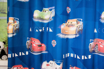 Verduisterend kindergordijn met o.a. monstertruck McQueen van Disney Cars. Een stoer jongensgordijn voor de kinderkamer van jonge autoliefhebbers!