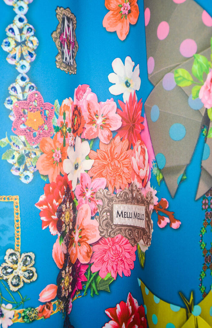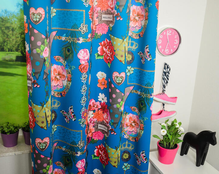 Een uniek gordijn van het hippe merk MELLI MELLO! Bloemen, Bling-Bling, Broccante, dit gordijn voegt deze stijlen fantastisch samen. De afbeeldingen zijn gedrukt op chique indigo blauwe stof, die de kamer gelijk prettig donker maakt. De achterzijde is gebroken wit en daardoor aardig warmtewerend. De ‘bloemenbunch’ is 25 cm in doorsnede en de vlinder 10 cm groot. Een stijlvolle trendy keuze voor de zelfbewuste, eigentijdse meid!