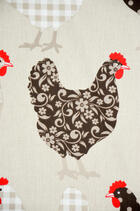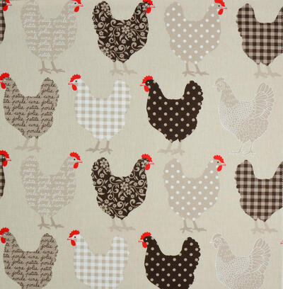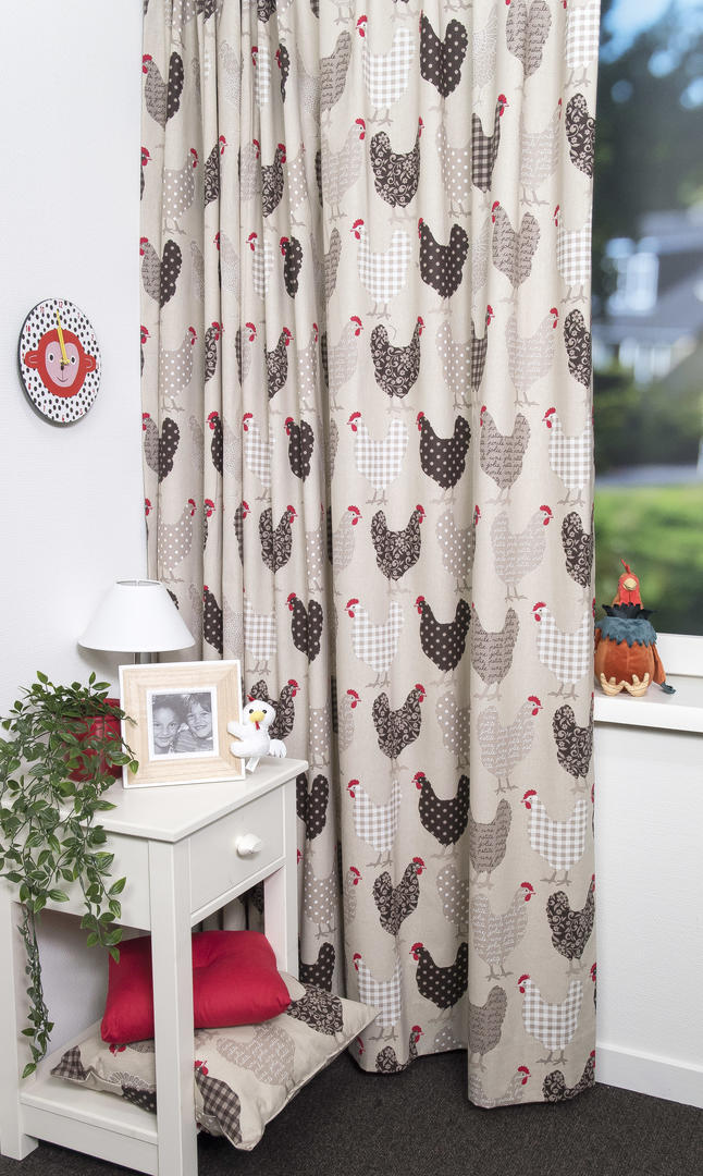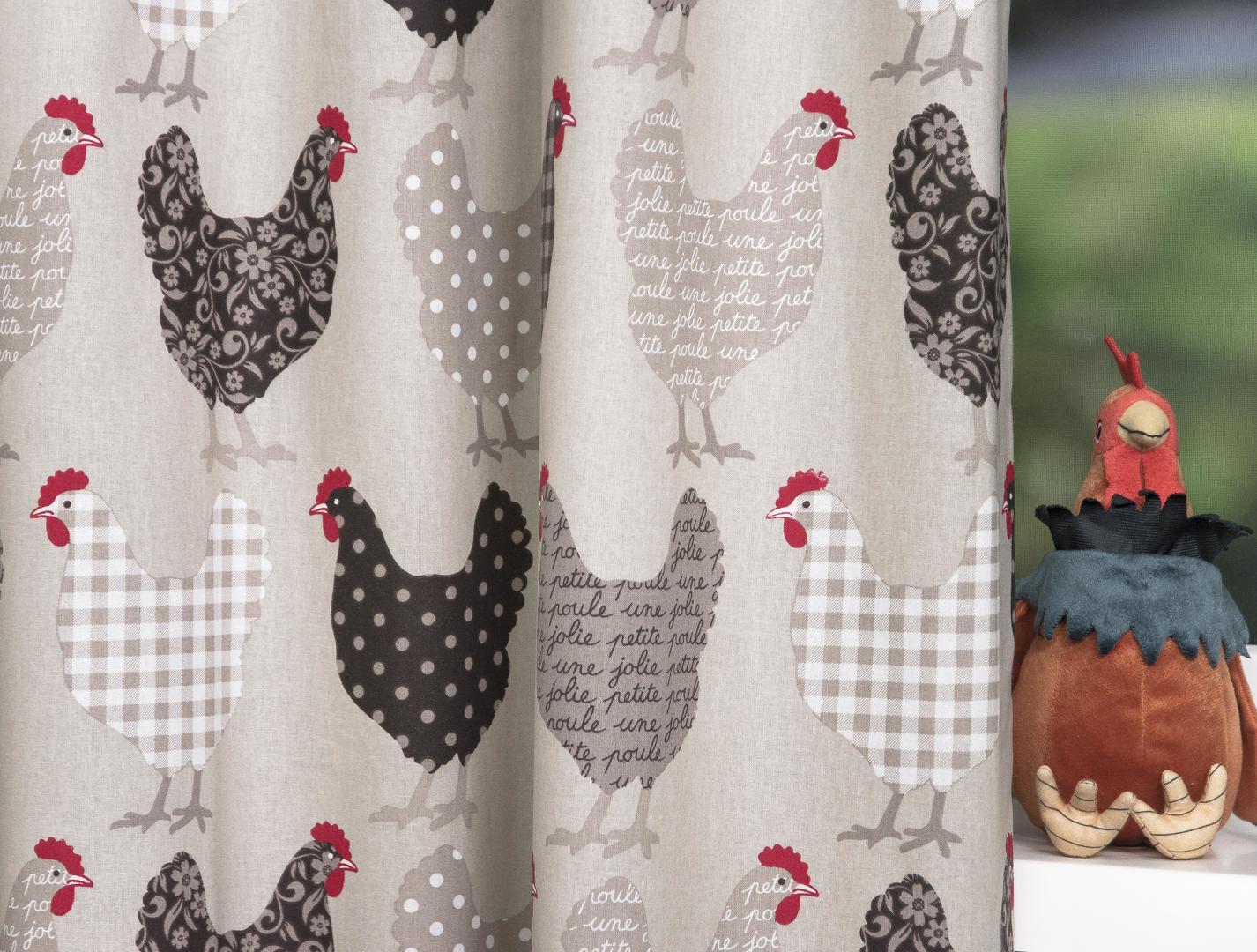 Een landelijk Frans gordijn gesierd met ‘une jolie petite poule’. ( vert: een vrolijke kleine kip) De kipjes zijn gedrukt op fijn geweven matte katoen. De ondergrondkleur is warm wit of licht vergrijsd taupe. Beide kleuren zijn warm en stijlvol gekozen. De afbeelding is op de voorzijde bedrukt en ongeveer 15 cm groot. Houd jij van een smakelijk bistro-ontbijtje: stokbroodje, eitje & jus d’orange? Dan is dit gordijn écht iets voor jou! Voor extra kleurbehoud kan je dit gordijn laten voeren, dan even aanvinken in het bestelproces.