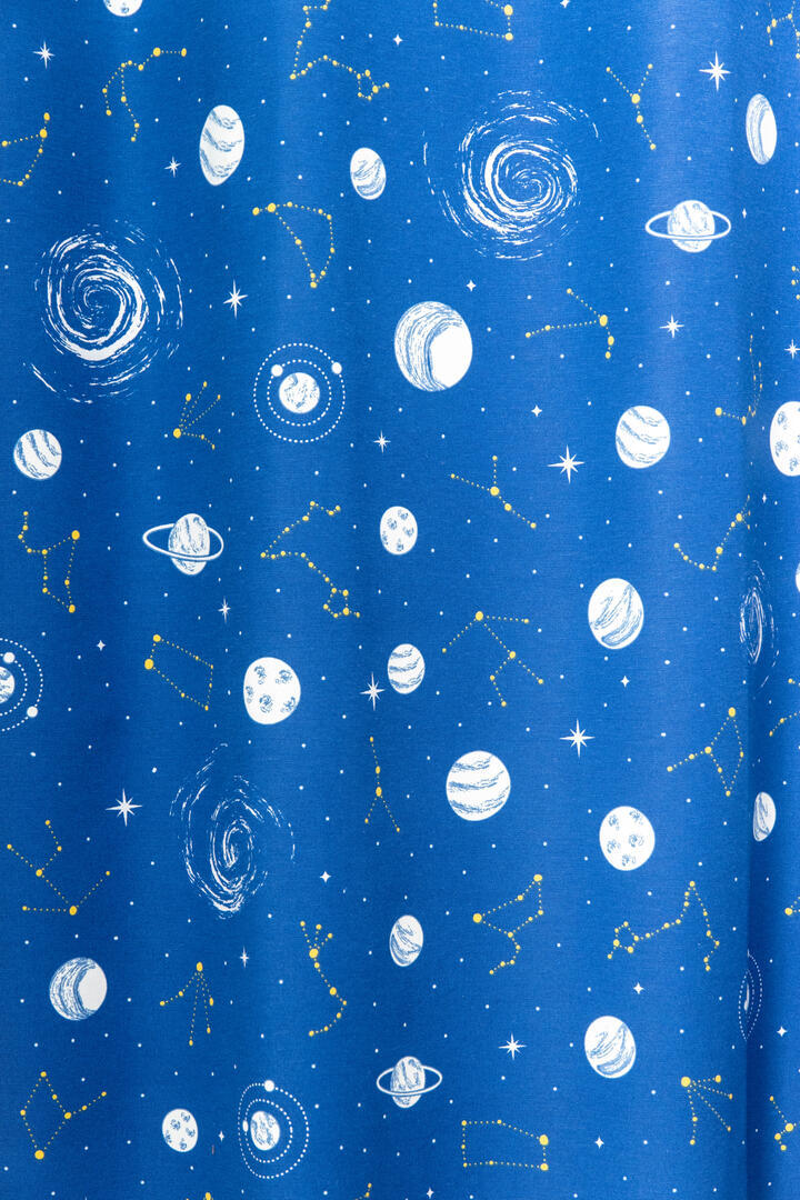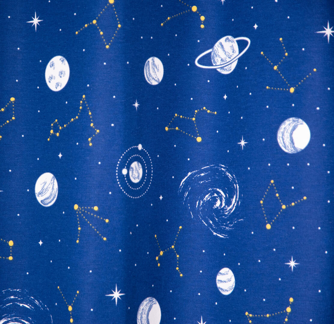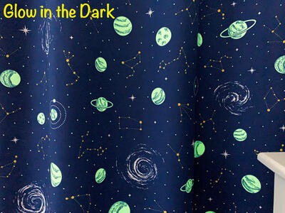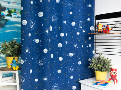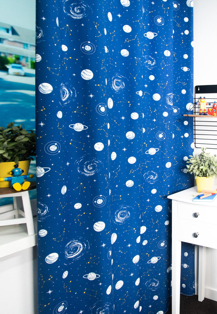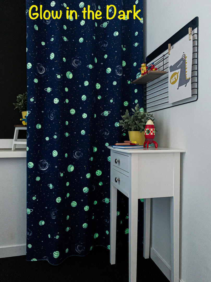 Een mooie sterrenhemel op deze speciale bedrukte kindergordijnstof met "glow in the dark" effect. In het donker geven de bedrukte planeten een lichte gloed af. Dit vervaagt langzaam als het donker wordt. Deze mooie stevige gordijnstof valt soepel. De print is aan de achterzijde licht zichtbaar.