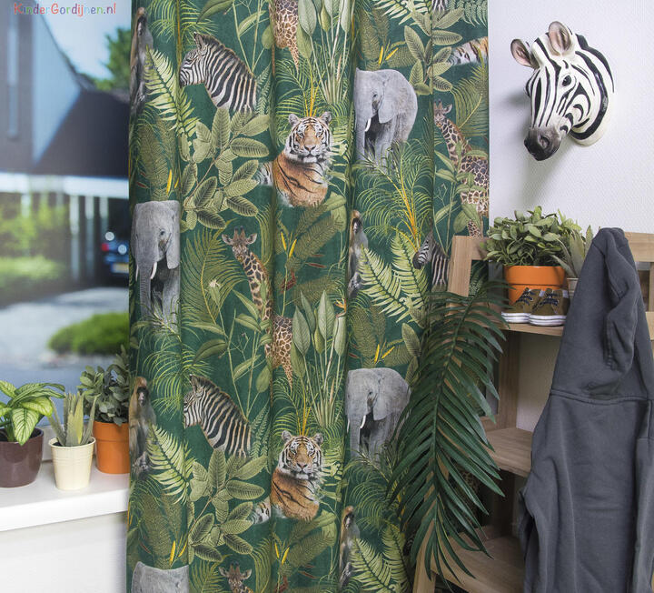 De Moremi is een speels en levendig gordijn dat de kamer vult met de avontuurlijke sfeer van de Afrikaanse savanne. De diepgroene achtergrond vormt het decor voor een prachtig tafereel van wilde dieren die tussen weelderige bladeren en tropische planten tot leven lijken te komen. Op de stof zijn onder andere zebra’s, giraffen, olifanten, tijgers, leeuwen en nieuwsgierige aapjes te zien, allemaal zorgvuldig afgebeeld tussen botanische vormen in verschillende tinten groen, zachtgeel en bruin. De stof voelt soepel aan en valt mooi in de plooi, ideaal voor een kinderkamer waarin gezelligheid en fantasie centraal staan. Dankzij de rijke kleurencombinatie en het gedetailleerde dessin is dit gordijn niet alleen praktisch, maar ook een echte blikvanger aan het raam. De Moremi-gordijnstof is ruim op voorraad, waardoor een snelle en zorgvuldige levering mogelijk is. Tijdens het bestelproces kan worden gekozen voor een voering.