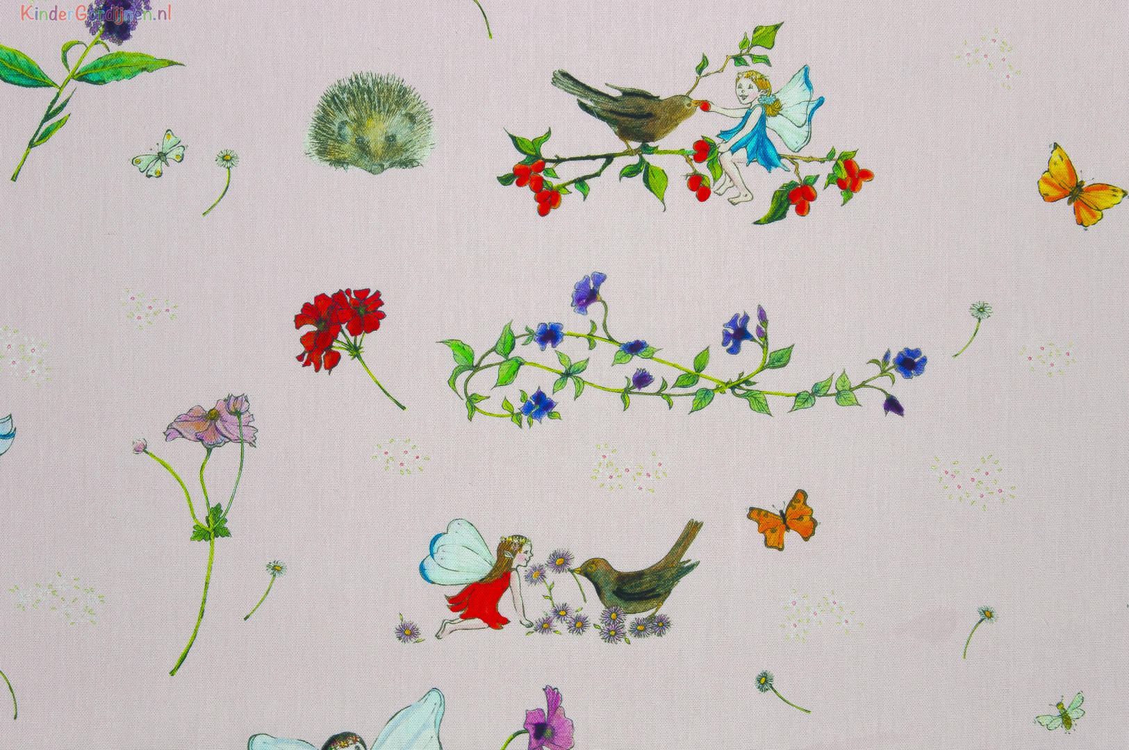 Een súper schattig meisjesgordijn voor de kinderkamer, ontworpen door Hanneke de Jager. Deze beeldend kunstenares is schrijver en tevens illustrator van een aantal bijzonder leuke kinderboeken. Zij omschrijft haar stijl als: fris, kleurrijk, levendig, speels en zonnig. Door gebruik van verschillende materialen zoals stofjes van de markt, knopen en gebreide truien, geeft zij haar illustraties iets unieks. In het patroon zie je namelijk de weergave van die leuke details van de verschillende texturen. Zo zit het vlindermeisje op een haast levensechte roos omringt door allemaal lieve dierenvrienden.