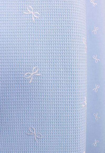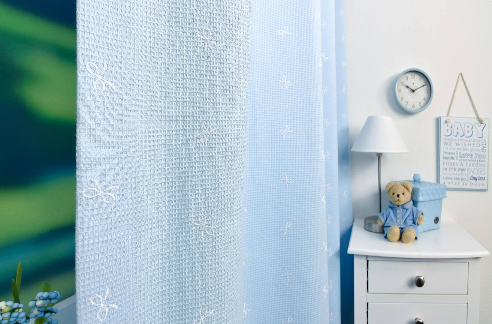 SCHATTIG! Een gordijn voor de babykamer dat rustig is en toch extra decoratief. Dat komt door de wafelpiqué structuur. Dit is een heel fijn ingeweven ribje, wat de stof optisch meer warmte geeft. In combinatie met een harde vloer (laminaat/ Novilon) geeft het daardoor een extra aantrekkelijke ‘boost’. De voor- en achterzijde hebben dezelfde kleur. Het geweven strikje is 2,5 cm groot en bij de blauwe en roze stof, wit van kleur. Bij de witte stof is het juist grijs en bij de zandkleur is het strikje iets donkerder zand. Dit fraaie babykamer gordijn combineert vast & zeker uitstekend met jouw hemeltje/ aankleedkussen en lakentjes.
