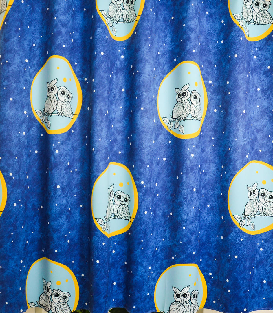 Dit is een ideaal gordijn: een leuke print die direct de kamer behoorlijk donker maakt. Dim out heet dat. Daardoor géén voeringkosten! Leverbaar in 2 kleurcombinaties, blauw met een wit motief en blauw met zachtblauw. De cirkel is 26 cm in doorsnede. Door dit royale patroon blijft de uilenprint rustig en kan het gordijn uitstekend tot de grond gemaakt worden. De witte spikkels lijken haast sterren aan de hemel te worden, zie jij dat ook?