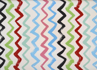 Gordijn Seismo is een speels en energiek kindergordijn dat direct leven brengt in de kamer. Het dessin bestaat uit verticale zigzaglijnen die strak van boven naar beneden lopen en samen een ritmisch patroon vormen. De afwisseling van kleuren zoals oranje, blauw, groen, geel, rood en zwart geeft het gordijn een vrolijke en levendige uitstraling die perfect past in een kinder- of speelkamer.