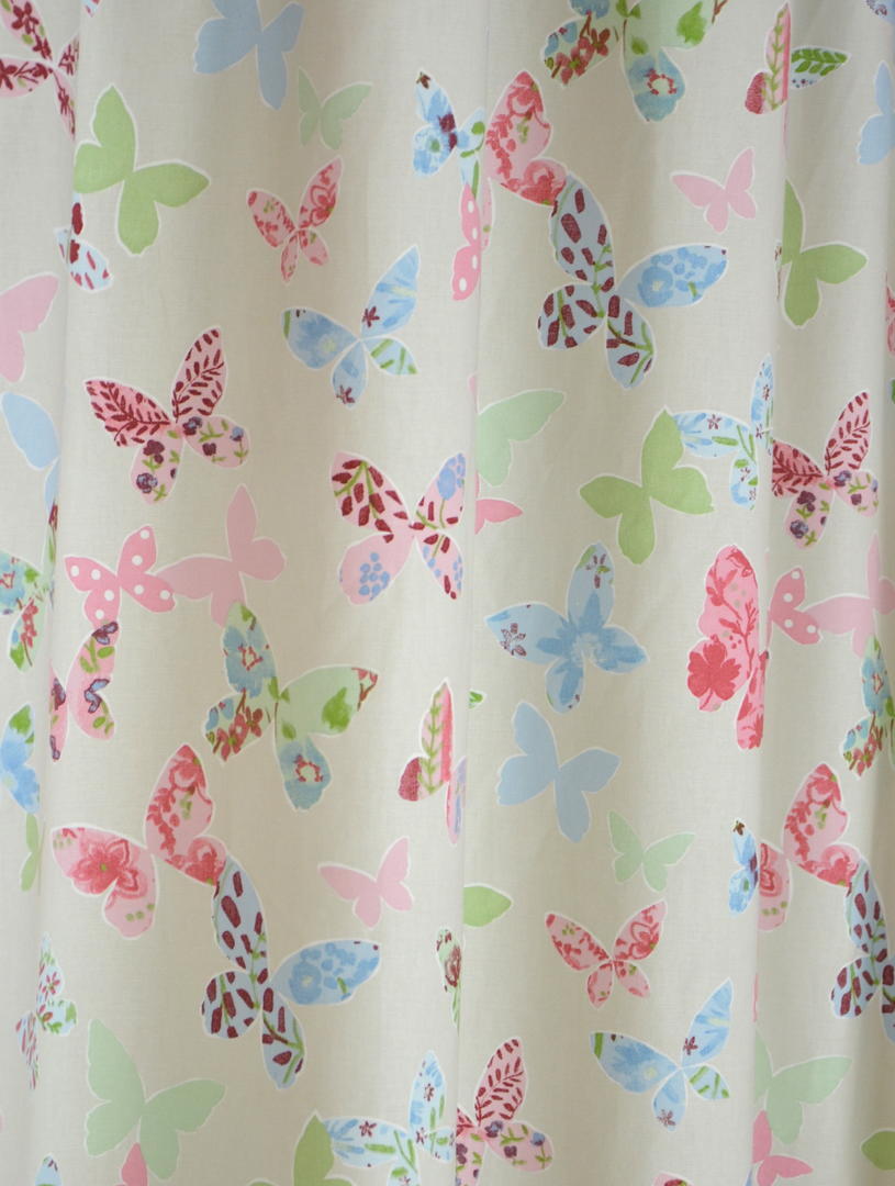 Vlinder, vlinder zoek me dan. Vliegen zó luchtig en sierlijk, ik kan daar wat van. Een vlinder verrast en streelt het oog, wat bijzonder om dat op een gordijn te ‘vangen’. Het kleurrijke & kunstzinnige, een ideale inspiratiebron voor een prachtig kindergordijn. De stof is leverbaar in 3 verschillende kleurcombinaties: een warm-witte ondergrond met roze en andere pasteltinten of zachtpaars met lavendelblauw. De andere ondergrondkleur is fraai zandkleurig, waardoor de witte omlijsting van de vlinders een extra dimensie geeft. De print is op de voorzijde gedrukt van de dicht geweven, matte stof. De weefstof is duidelijk van mooie kwaliteit, het heeft een vlotte en sportieve uitstraling. Heel leuk om een tintje uit dit gordijn op de wand te schilderen, dat geeft een extra sprankelend effect. Kies jij voor dit sierlijke & tijdloze vlinderpatroon?